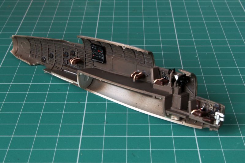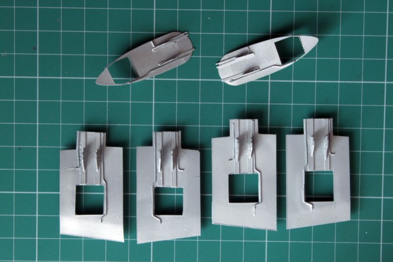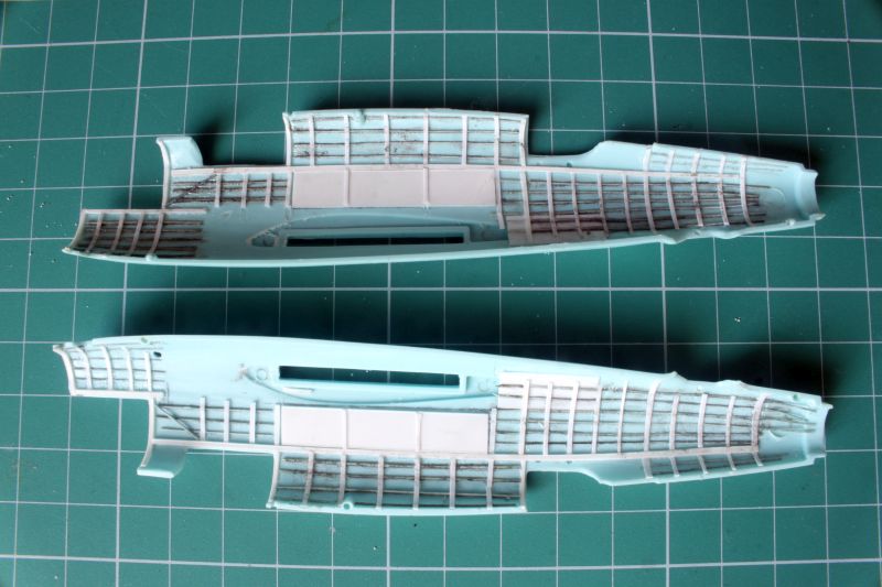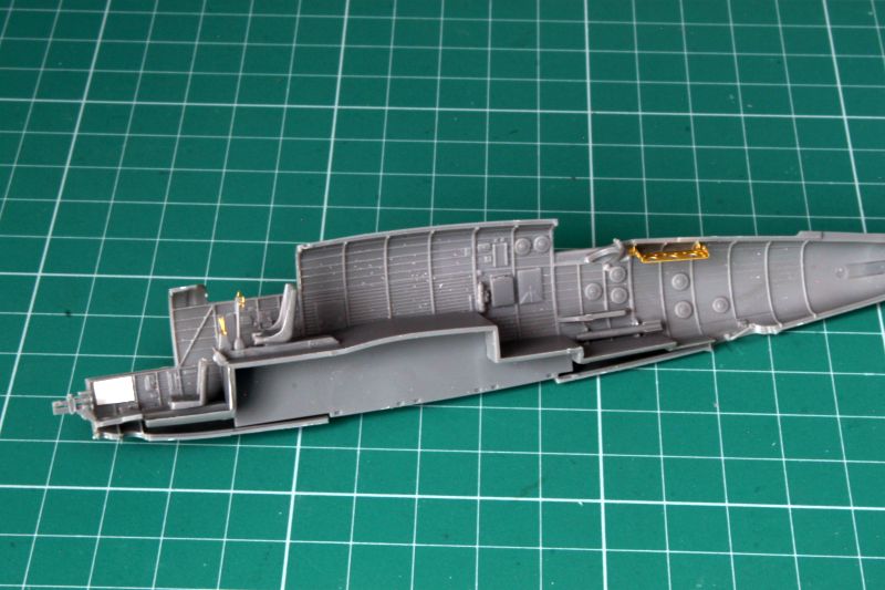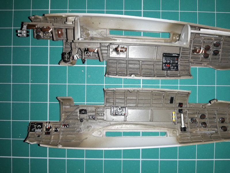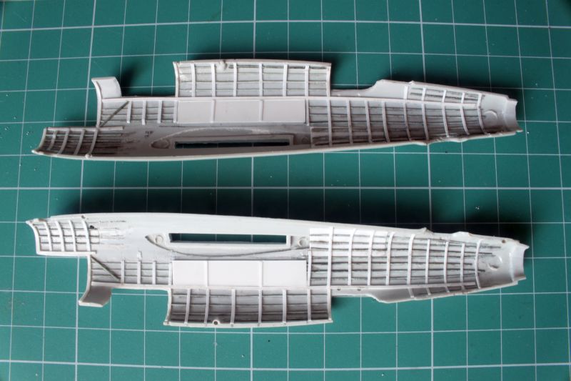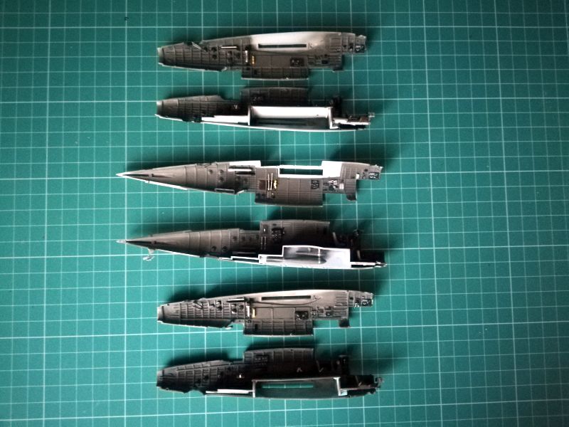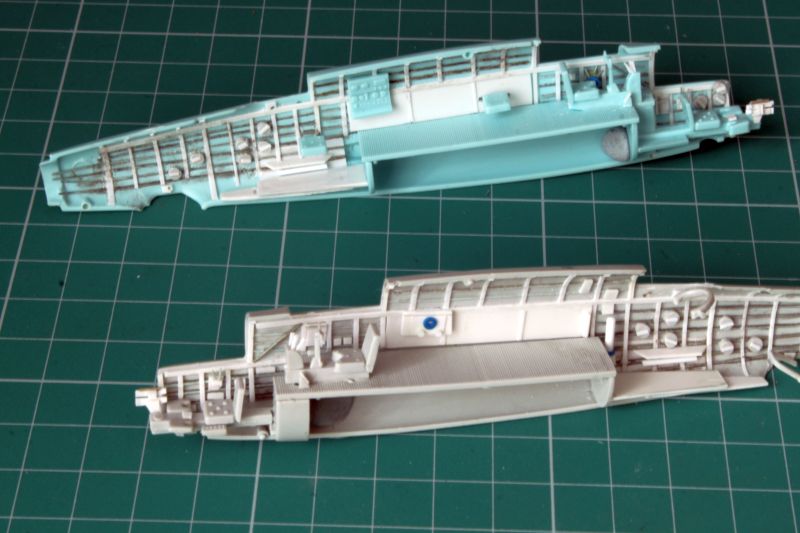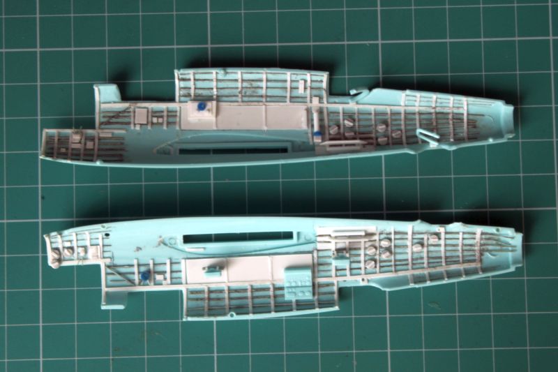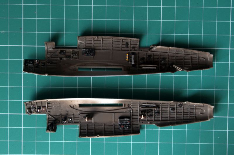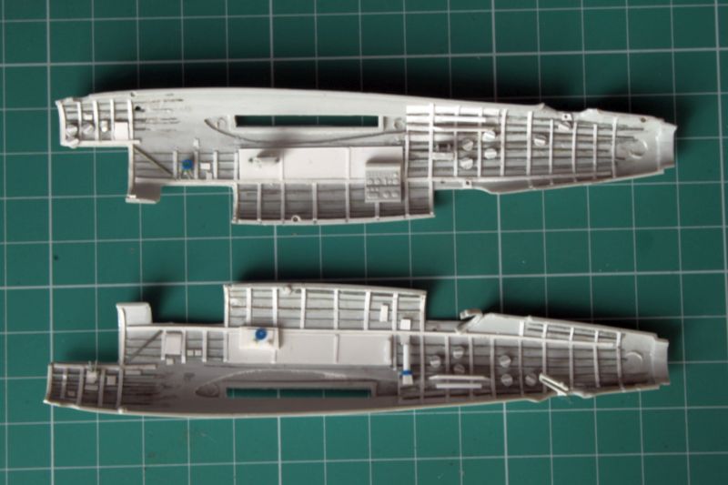 Budowę obu weteranów zacząłem nieco wcześniej, niż budowę modelu z nowego, jeszcze ciepłego zestawu IBG Models. Postanowiłem zwaloryzować im wnętrza kadłubów, luków podwozia, ale linie podziału pozostawić oryginalne, wypukłe, żeby oba modele nie zatraciły swego vintagowego charakteru. Waloryzację postanowiłem wykonać, od podstaw, tak jak robiono to w latach 80-tych ubiegłego stulecia. Jedyne współczesne akcesoria jakie zamierzałem wykorzystać, to zestawy YahuModels oraz maski P-Mask. Sporo czasu poświęciłem na odtwarzanie konstrukcji kadłuba wraz wyposażeniem, ale z efektu jestem zadowolony. Nie jest to może stu procentowa zgodność z oryginałem, ale tu nie o to chodziło. Nie zamierzałem budować repliki pod konkursy modelarskie, ale po prostu dobrze się bawić i mieć fajny model na półce. Poza tym warto sobie czasem zrobić taki sprawdzian własnych umiejętności i trochę poćwiczyć warsztat. Dobre modele to wcale nie metry kwadratowe fototrawionych blach i kilogramy żywicy. Samo się to przecież nie sklei. Montaż wnętrza w modeli IBG ograniczał się natomiast do wklejeniu kilku detali w burty kadłuba i złożenie podłogi wraz z kadłubowym lukiem bombowym.