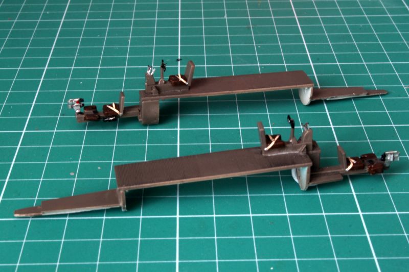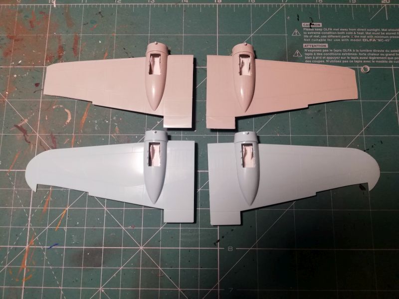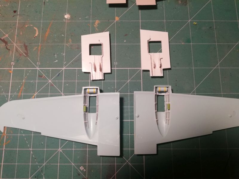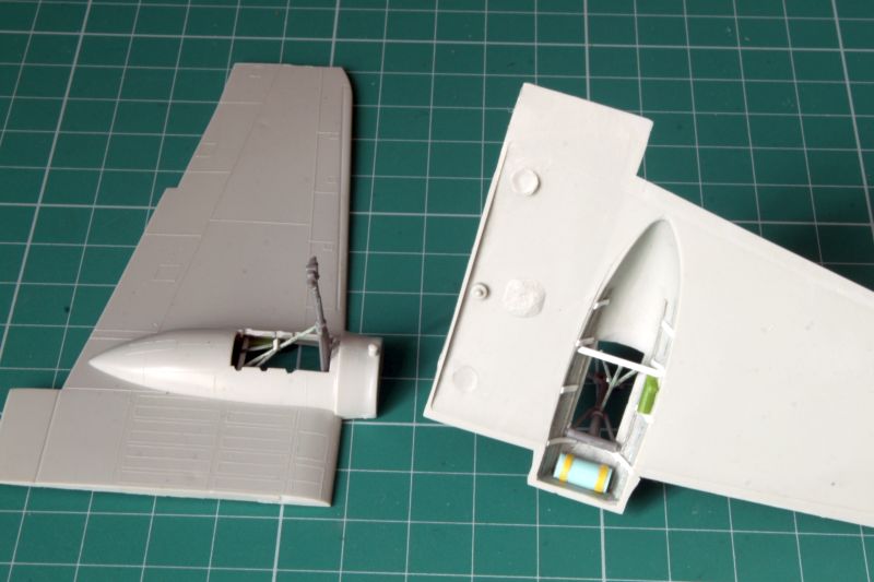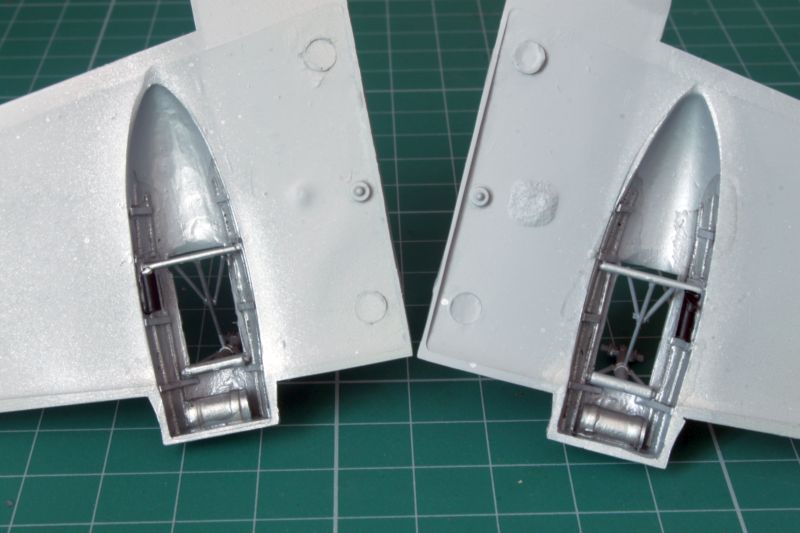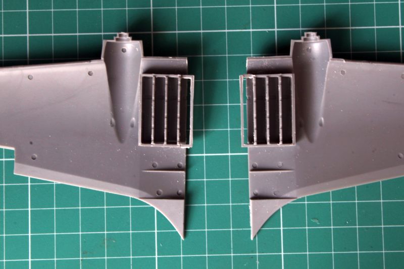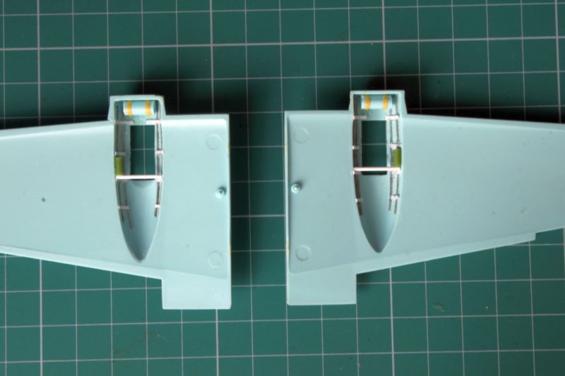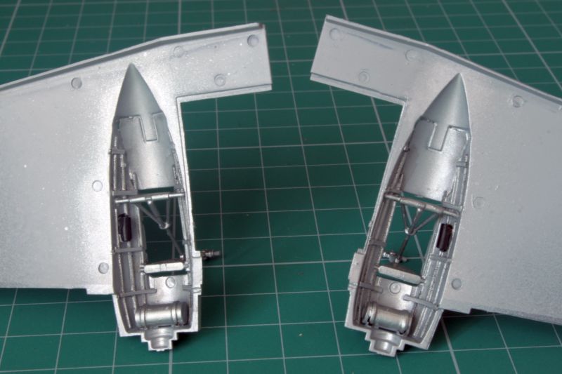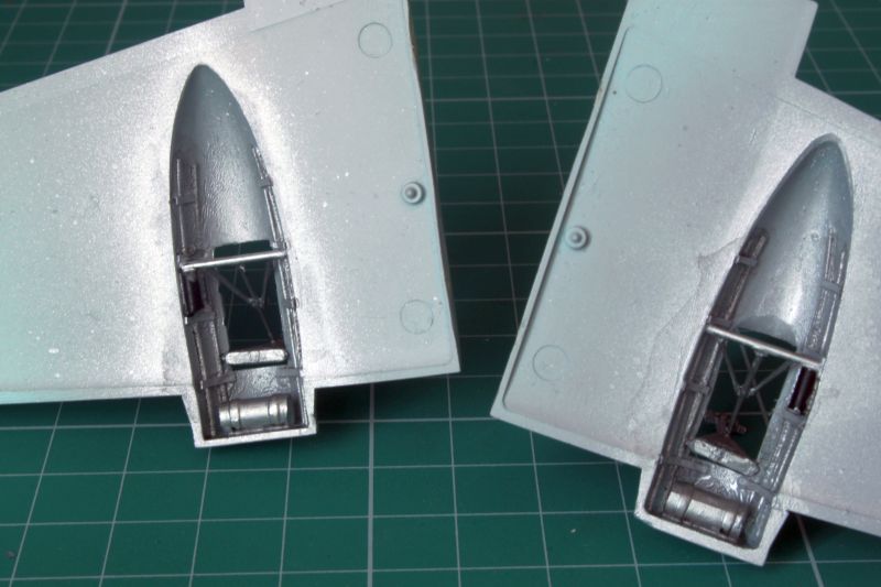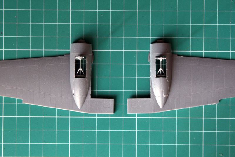 W przypadku wszystkich trzech zestawów tyle samo pracy musiałem poświęcić lukom podwozia głównego. W ZTS nie było dosłownie nic, w IBG wnętrza luków z blaszek wymagały trochę uzupełnienia o przewody, czy imitację konstrukcji samych gondol. Oczywiście w IBG wszystko było doskonale spasowane, w ZTS musiałem wszystko zrobić i spasować we własnym zakresie. W sumie z efektu jestem zadowolony. Dokonałem też ciekawego odkrycia. Otóż końcówki połówek skrzydeł różniły się od siebie w przypadku obu wypustów, co obrazuje powyższe zdjęcie.