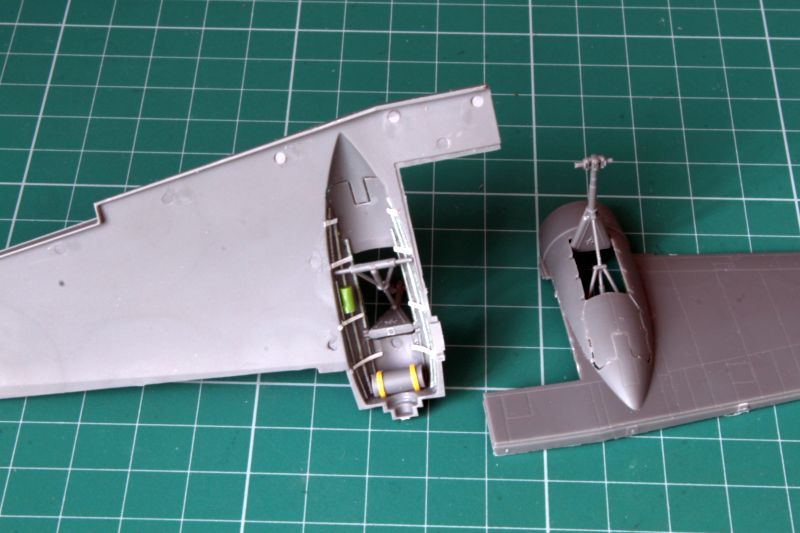 Golenie podwozia postanowiłem wykonać w taki sposób jak zaprojektowane to zostało w modelu IBG. Dobrze, że nowy zestaw ma dwa rodzaje goleni podwozia z pięknie odwzorowanymi amortyzatorami Kubickiego, postanowiłem zastosować je także ZTS-ach. Drugi komplet pozyskałem od Sokoła, z plastikowych prętów, wykonałem tylne części goleni i umieściłem na swoich miejscach w lukach. Modele ZST wymagały także wykonania nacięć na zawiasy pokryw luków.