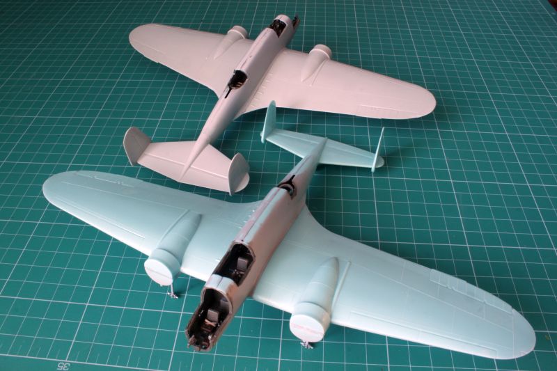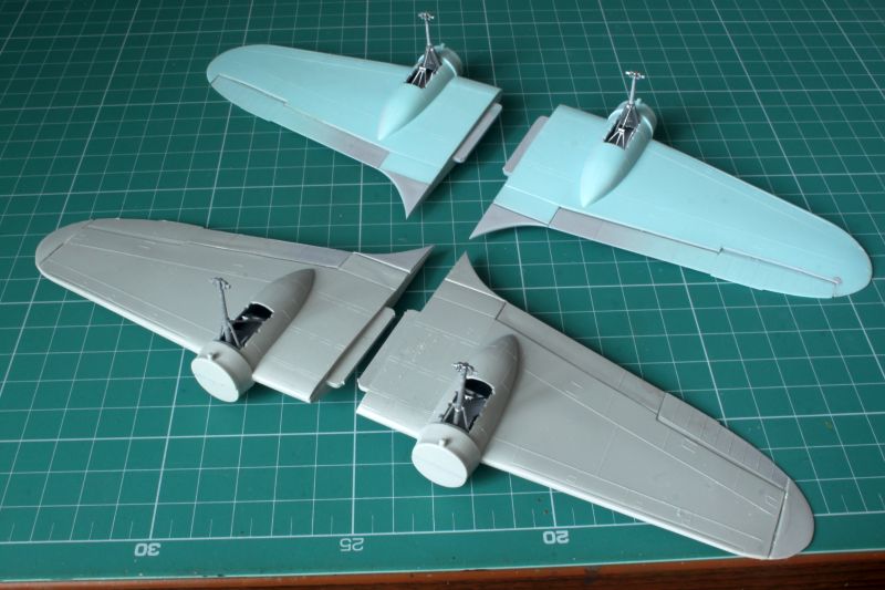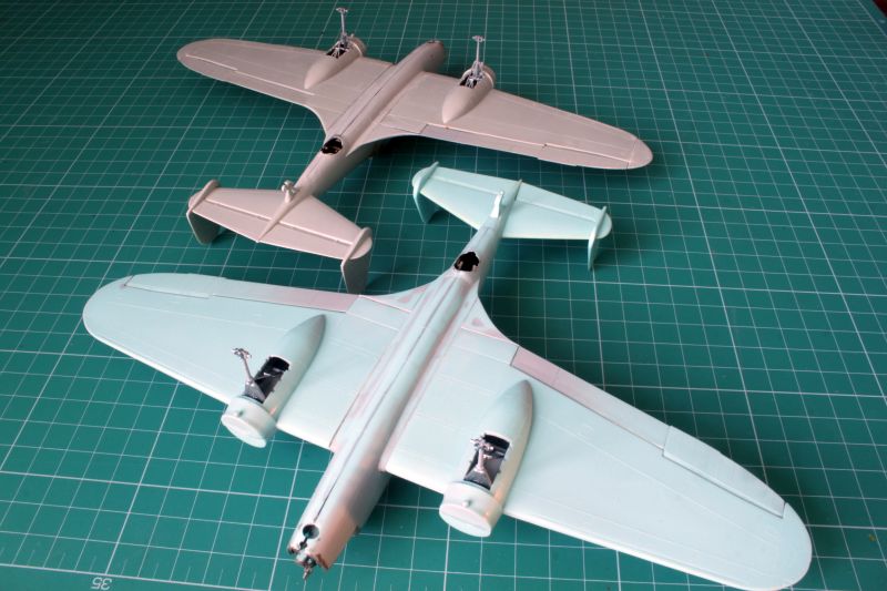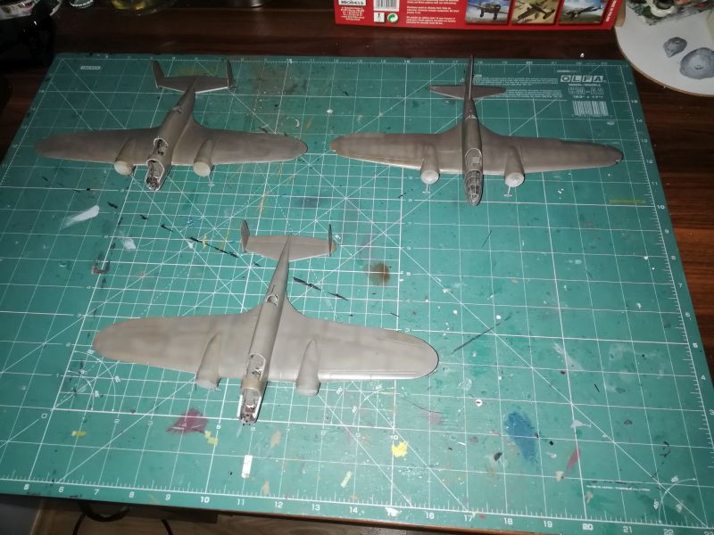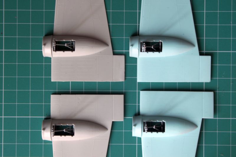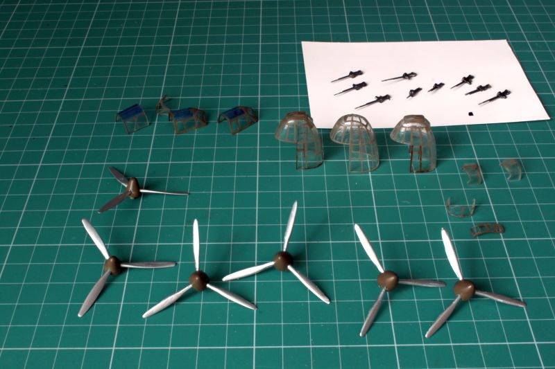 Potem mogłem zamontować w replikach wszystko to, co musiało być pomalowane osobno. W przypadku nowego zestawu z IBG Models była to formalność, bo wszystko pasowało idealnie. Zabawa zaczęła się jednak, kiedy przyszło do montażu oszklenia w modelach z Pruszkowa. Zapomniałem po prostu, że osłony przedziału bombardiera oraz w kabiny pilota nie pasują do kadłuba. „Szklarnia” na dziobie jest o dobry milimetr za wysoka, a kolei osłona kabiny pilota jest za wąska. Podobnie osłona stanowiska tylnego strzelca. Jakoś udało mi się dopasować oszklenie nosa, osłonę stanowiska strzelca przykleiłem w pozycji otwartej, zaś osłonę kabiny pilota po japońsku  na „jako tako”. Pewnie z czasem rozetnę ją  i także przykleję w pozycji otwartej. Przyklejenie reszty detali na szczęście obyło się bez niespodzianek.
