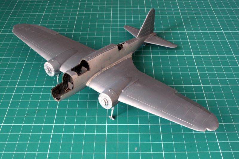 Złożenie w całość modelu IBG jak się można było domyślać przebiegło niemal bezproblemowo. Napisałem tak dlatego, że musiałem trochę spałować zewnętrzne ścianki komór bombowych, aby zamknąć połówki skrzydeł i wkleić je w kadłub. Jednak problem leżał po stronie modelarza a nie modelu, bo z tego co wiem, Sokół w swoim Łosiu takich przygód nie miał. Przy okazji zaszpachlowałem wklęśnięcia w sterze kierunku i w lotkach. Użyłem do tego gęstego kleju cyjanoakrylowego, który nałożyłem zaostrzoną wykałaczką, uważając, aby nie zabrudzić faktury powierzchni. Po jego dokładnym wyschnięciu obrobiłem go przy pomocy płaskich pilników i kawałka papieru ściernego. Po raz kolejny usuwanie drobnej usterki modelu zajęło mniej czasu niż pisanie na jej temat po forach internetowych.