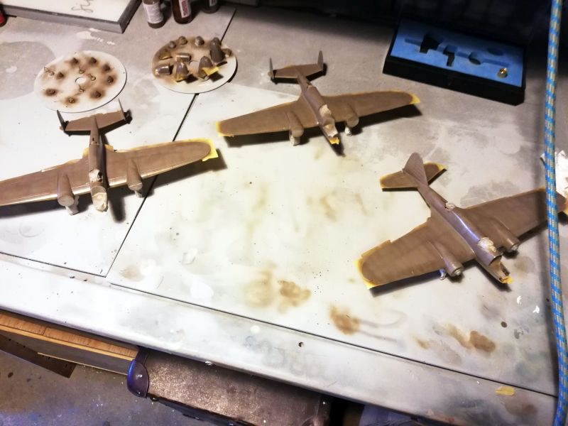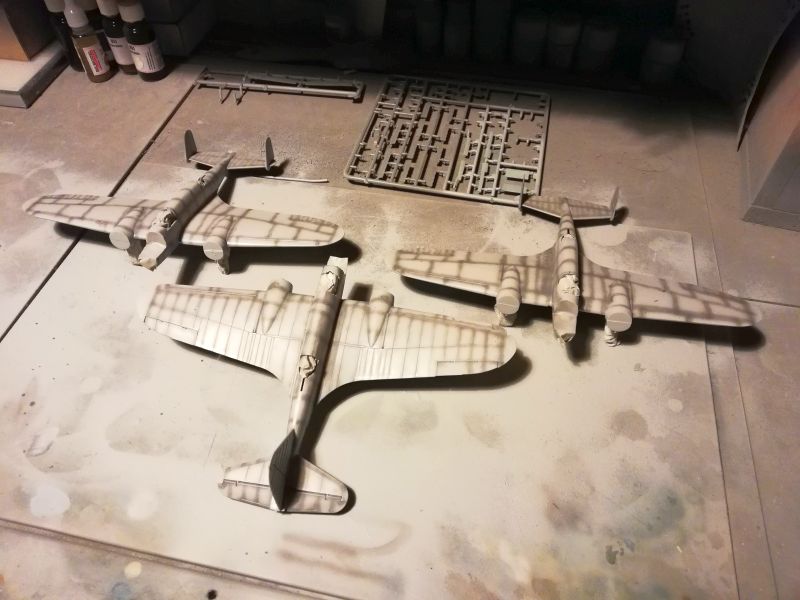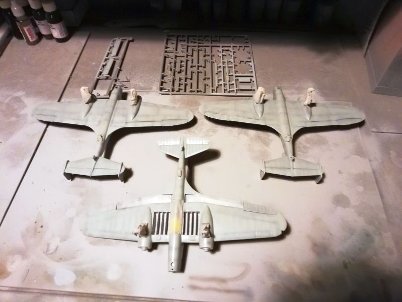 Do malowania użyłem lakierów Bilmodelu i Hataki z palety Orange Line. Spod to błękitny lakier Bilmodelu z domieszką szarej i srebrnej, zaś khaki to także Bilmodel, ale z dodatkiem brązowej Hataki, wyszedł trochę za mało czekoladowy, no ale trudno. Przed nałożeniem podstawowych kolorów kamuflażu, moje miniatury otrzymały preshading z szarej farby. Po zakończeniu malowania wykonałem niezbędne poprawki malarskie, pomalowałem także wszystkie drobne elementy takie śmigła, chłodnice czy kolektory spalin. W karabinach maszynowych z zestawów ZTS wymieniłem lufy oraz magazynki.