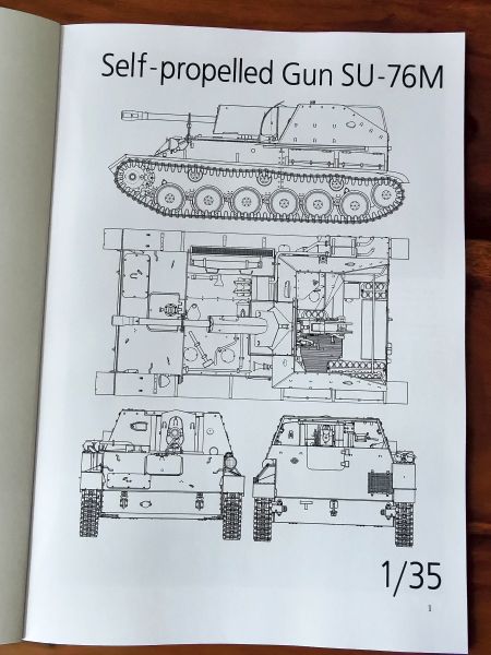 Opracowanie zaczyna się planikiem „Suczki” – tak nieoficjalnie nazywały działa Su-76 ich załogi, ponieważ były one znacznie mniejsze od Su-85 czy Su-100 czyli „dorosłych Suk”. Planik opracowany został w skali 1/35 i składa się jedynie z czterech podstawowych rzutów. Jest on dość szczegółowy, ale bardziej skorzystają na nim modelarze, którzy swoje miniatury będą budować w podziałce 1/72. Dlaczego? Wyjaśnię to poniżej.