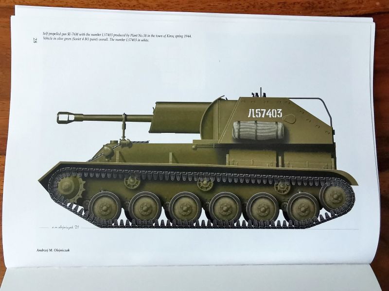 Ostatnie strony książki poświęcone są egzemplarzom muzealnym dział Su-76M. Są zdjęcia zachowanych „Suczek” z całego świata, zabrakło natomiast zdjęcia egzemplarza z Muzeum Oręża Polskiego w Kołobrzegu, jednego z najlepiej zachowanych do chwili obecnej. Nie umniejsza to jednak wartości publikacji jako całości. Na samym końcu znajduje się barwna plansza autorstwa A. M. Olejniczaka przedstawiająca rzut boczny działa w malowaniu radzieckim a konkretnie wozu L57 403. Jest to przykładowe malowanie, ponieważ większość pojazdów tego typu nosiła jednolite oliwkowo zielone malowanie. W tym miejscu warto dwa słowa poświęcić modelom „Suczki”, bo przecież mamy do czynienia z publikacją adresowaną stricte do modelarzy. Ci, którzy preferują skalę 1/35 są w bardzo dobrej sytuacji. Mają bowiem do dyspozycji dwa zestawy – bardzo dobry z Tamiyi i znakomite, nowe opracowanie firmy MiniArt. Nieco gorzej mają ci, którzy swoje modele wykonują w skali 1/72. Replikę „Suczki” w tej skali i to w różnych wersjach, można wykonać w oparciu o zestaw firmy UM Models, dość prosty i wymagający dużo pracy oraz żywiczną miniaturę firmy Modelkrak, niewiele lepszą, ale trudno dostępną, bo od dawna nie produkowaną. Dlatego z planów na początku publikacji bardziej skorzystają modelarze budujący repliki w skali 1/72 a nie 1/35.