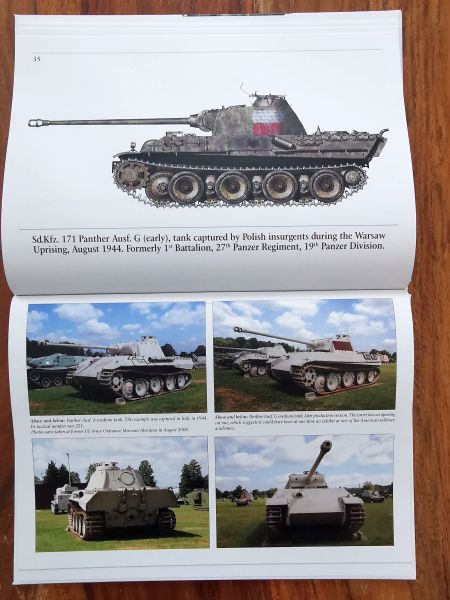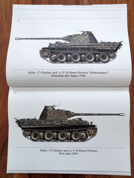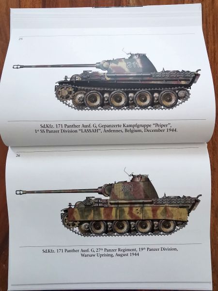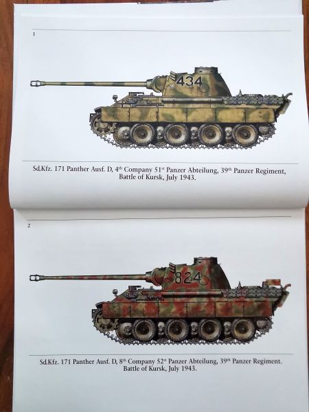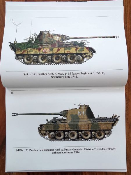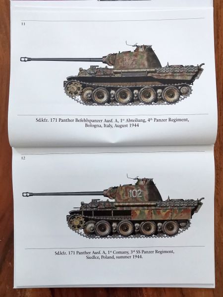 Zasadnicza część opracowania to sylwetki barwne. Jest ich przeszło trzydzieści. Od razu widać wielką dbałość o najdrobniejsze nawet szczegóły wyposażenia, malowania oraz wielu cech indywidualizujących poszczególne wozy. Widać także, że autor posmęcił wiele czasu na analizę zdjęć archiwalnych, na podstawie których te sylwetki powstały. Jest to przekrój przez wszystkie teatry wojenne na których działały Pantery. Od chrztu bojowego w bitwie na Łuku Kurskim, poprzez kampanię włoską, Normandię, Ardeny czy obronę Berlina. Są także Pantery z naszego podwórka, walczących na terenie Polski, Prus Wschodnich czy Litwy. Nie mogło oczywiście zabraknąć pojazdów z Powstania Warszawskiego. Są aż dwie, jedna niemiecka…