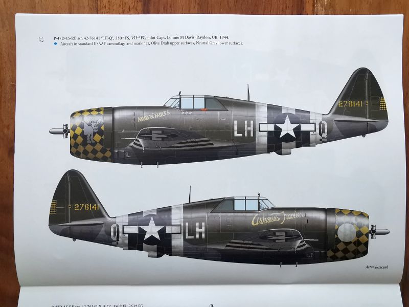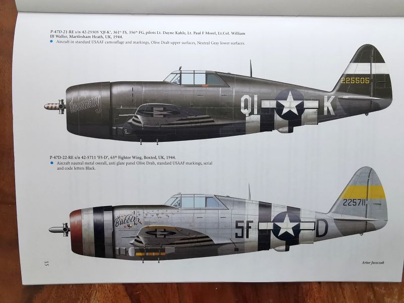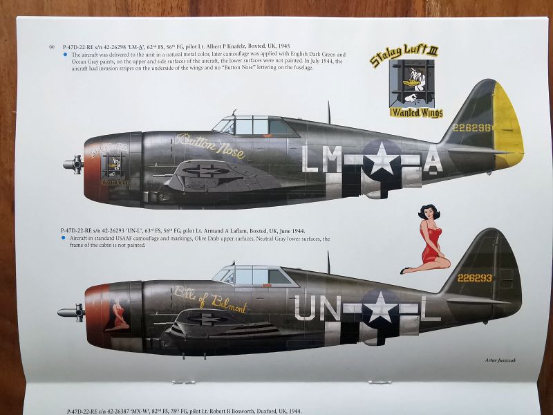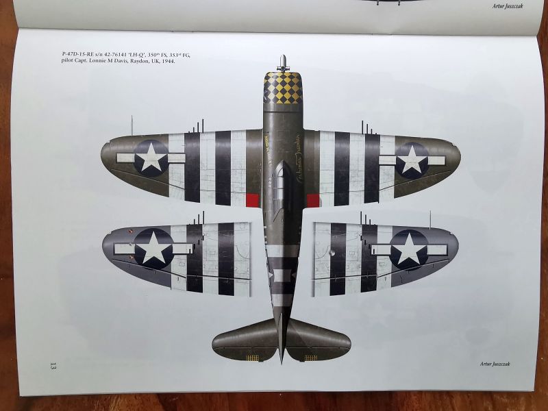 Dalsza część publikacji to barwne sylwetki, dwanaście bocznych i jedna w czterech rzutach. Trzeba przyznać, że malowania wybrano oryginalne i nie tuzinkowe, co pokazuje jak bogate jest zagadnienie malowań P-47 biorących udział w D-Day. Z dużą częścią tych malowań zetknąłem się po raz pierwszy. Mogą być one inspiracją do popełnienia nie jednego modelu, tym bardziej, że zestawów w obu skalach nie brakuje. Z tego zestawienia może skorzystać także nie jeden producent kalkomanii, dlatego także oni powinni zwrócić uwagę na tę publikację.
