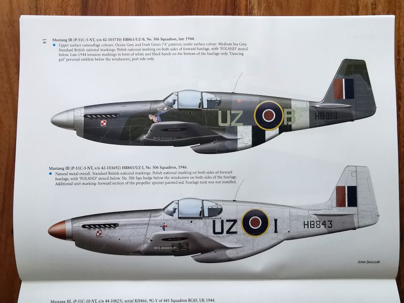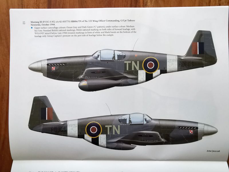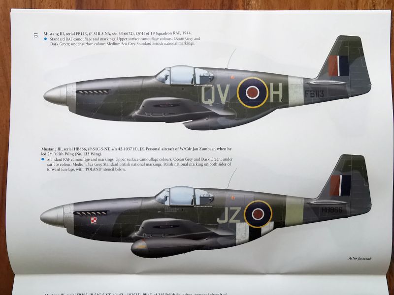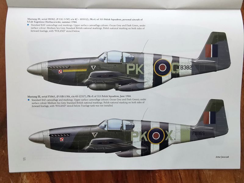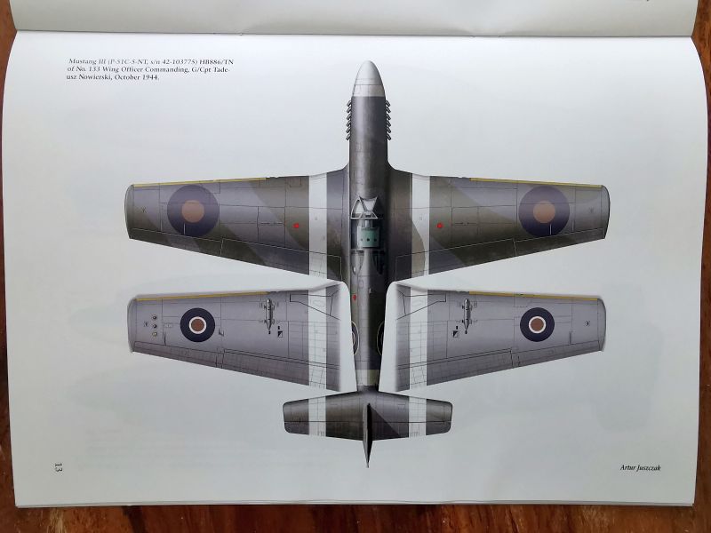 Sylwetki barwne z wybranymi przykładami malowań stanowią kolejną część publikacji. Przedstawiono ich szesnaście, zaś jeden z nich, osobistego samolotu G/Cpt Tadeusza Nowierskiego to pełen schemat w czterech rzutach. Mustangom służącym w PSP poświęcono zresztą sporo uwagi, bo pokazano je aż na pięciu sylwetkach. Pozostałe to samoloty służące w dywizjonach brytyjskich, australijskich i kanadyjskich, wszystkie z ETO, ale nie tylko Wyspy Brytyjskie i Francja, ale także front włoski. Na koniec uwaga dotycząca obu publikacji. Przy sylwetkach barwnych znajdują ich opisy w języku angielskim, zaś na ostatnich stronach obu publikacji ich polskie tłumaczenia.