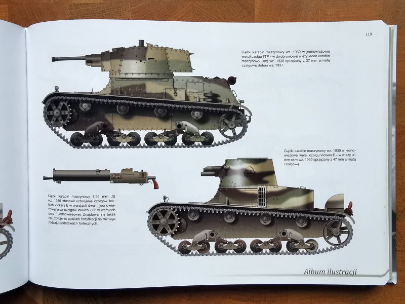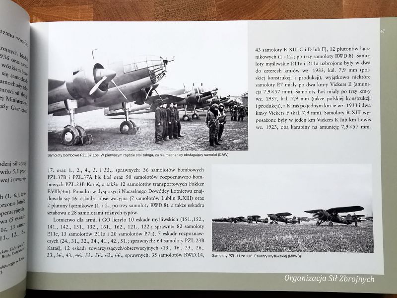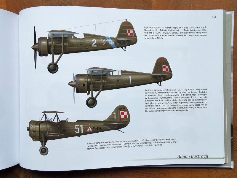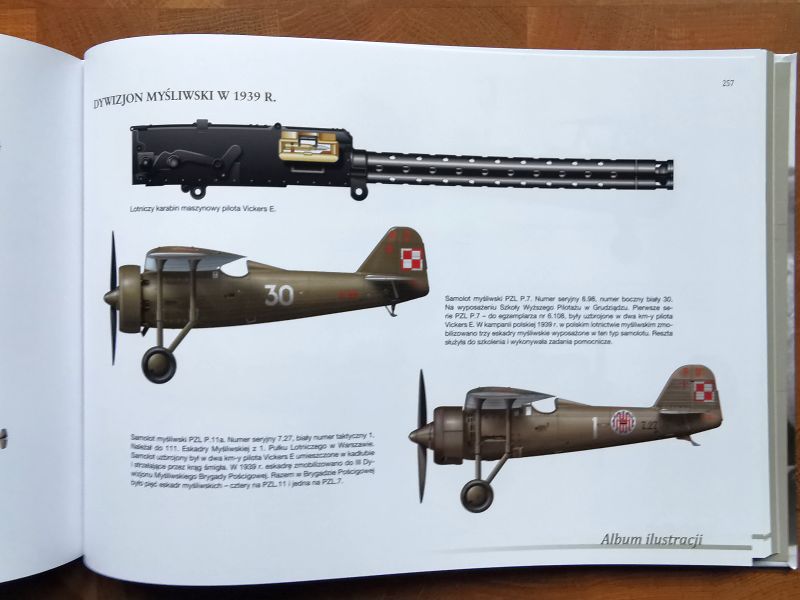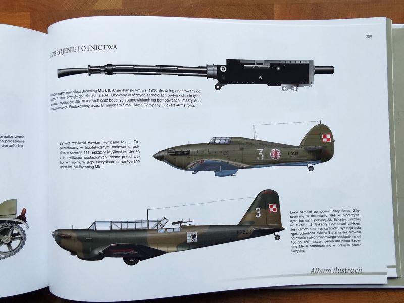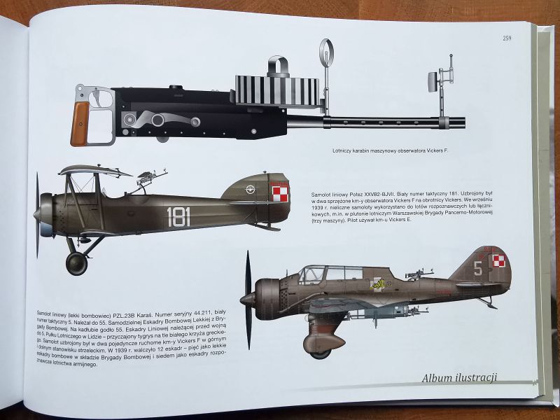 W "Albumie Ilustracji" bardzo obszernie potraktowano także siły powietrzne. Omówiono większość typów samolotów używanych w polskim lotnictwie wojskowym, od bojowych poprzez szkolne i towarzyszące. Warto także zwrócić uwagę na to, że konkretny typ samolotu pokazano razem z przenoszonym przez niego uzbrojeniem. Jedyne, czego mi zabrakło to samoloty lotnictwa morskiego. Autorzy ograniczyli zagadnienie jedynie do wodnosamolotu bombowo – torpedowego CANT Z.506B Airone, pomijając zupełnie samoloty Lublin R-VIII hydro i R-XIII hydro oraz prototypy samolotów RWD-17W oraz Nikol A.2. Kilka storn każdej części „Albumu ilustracji” poświecono natomiast porównaniu sprzętu używanego przez wojsko polskie z jego niemieckimi odpowiednikami. Uważam, że to bardzo dobry pomysł, zwłaszcza w kierunku tych odbiorców, którzy dopiero zaczynają swą przygodę z historią, a ta publikacja jest jedną z pierwszych w ich biblioteczkach.