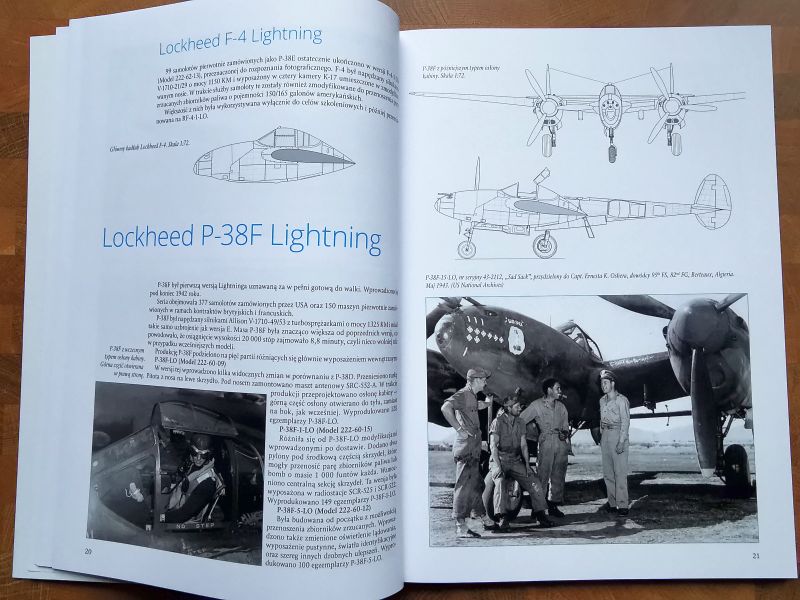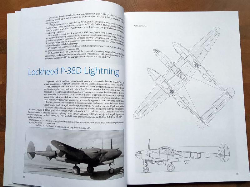Początkowe strony monografii to krótka historia powstania najpierw genezy samolotu a później samej konstrukcji. Pokazany jest tu proces projektowania oraz badania nad prototypami XP-38 oraz YP-38. Następnie czytelnik ma okazję zapoznać się z omówieniem wczesnych odmian P-38 od wersji D do wersji H włącznie, wersjom przeznaczonym dla Wielkiej Brytanii oraz odmianom rozpoznawczym F-4 oraz F-5. Tekst jest bardzo bogato ilustrowany znakomitej jakości zdjęciami archiwalnymi, które przeplatają się planami poszczególnych wersji wykreślonymi w podziałce 1/72 a także renderami 3D.