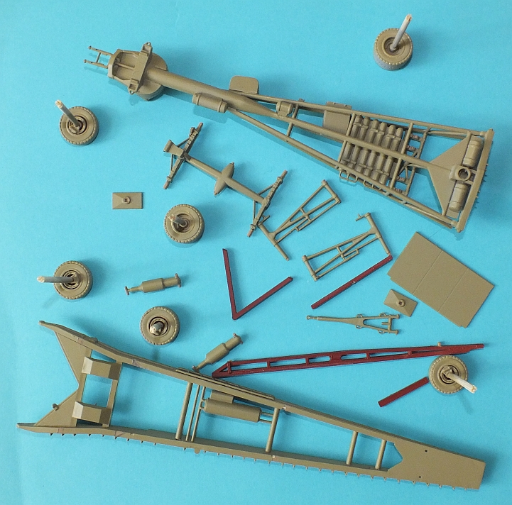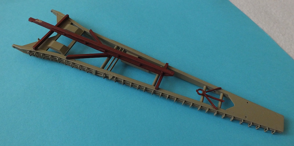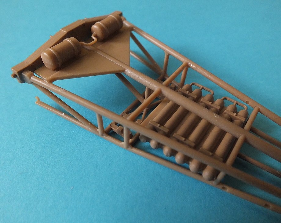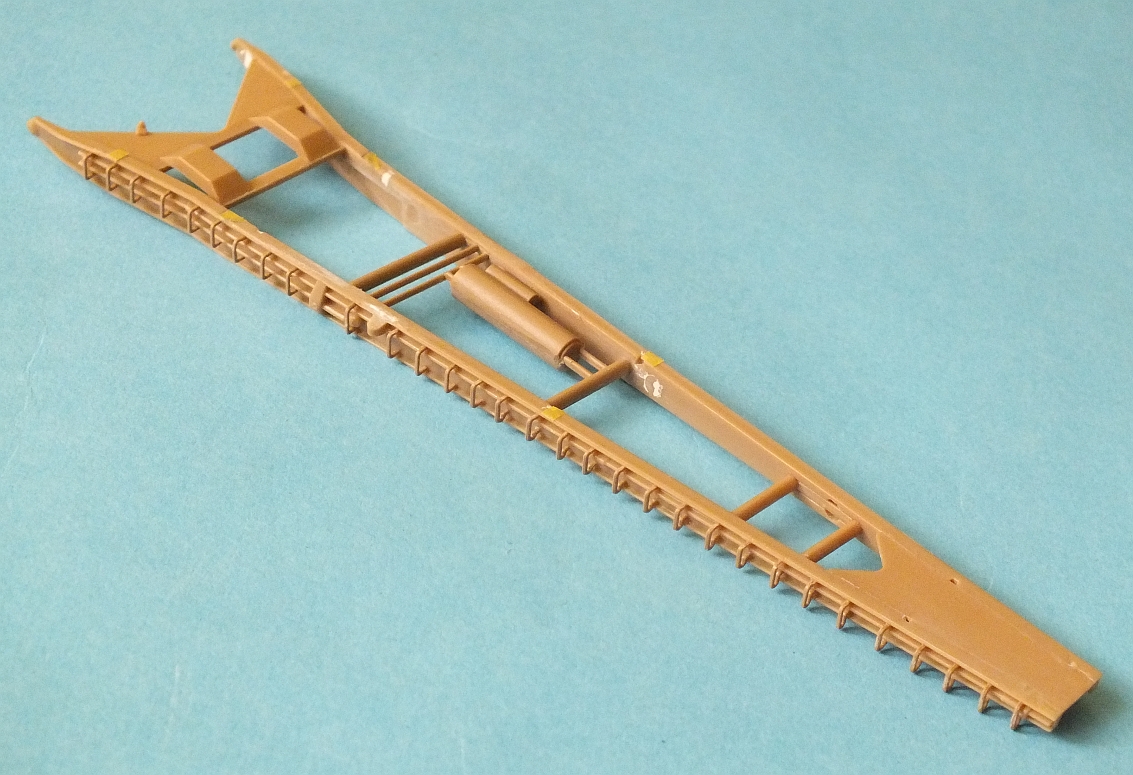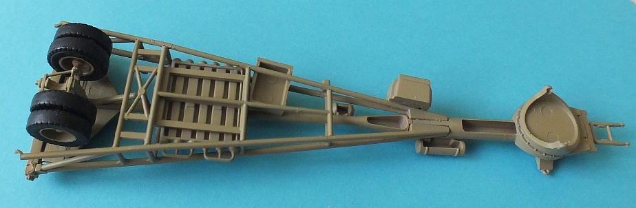 Hmmm…, wbrew pozorom montaż poszedł bezboleśnie. W tym modelu wszystko do siebie pasuje - jak ulał. Do tej ramy przymocowałem jeszcze parę dodatków. Jeden z nich musiałem uzupełnić szpachlówką. Z jednej strony wygląda całkiem, całkiem, ale z drugiej strony ramy, jak popatrzysz, to wielka dziura. Element wypełniłem szpachlówką (Wamod, ma się rozumieć…), przeszlifowałem, przykleiłem do ramy i gra gitara… Przy okazji dokleiłem obrotnicę przedniego wózka…