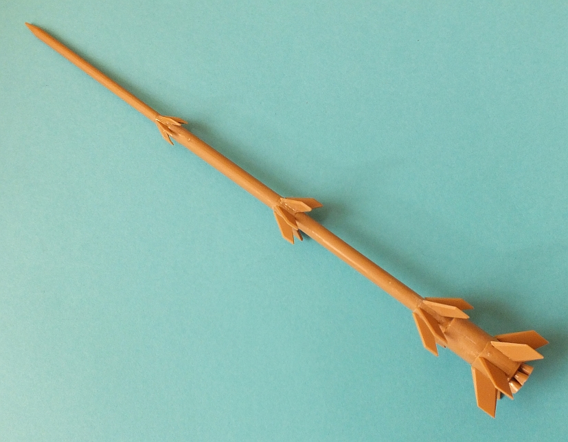 Na początek zabrałem się za montaż rakiety. Trochę nie ta kolejność, jak w instrukcji, ale co tam – taki kaprys… Przy składaniu części składowych rakiety w całość sugeruję zwrócić szczególną uwagę na osiowość. Elementy nie są dopasowane na wcisk, jest mały luz i niewłaściwe sklejenie spowoduje, że rakieta przyjęłaby kształt bumeranga. Tego raczej byśmy chcieli uniknąć – wystrzelona rakieta w sprzyjających okolicznościach mogłaby do nas wrócić, a 40 kg ładunku wybuchowego mogłoby narobić trochę szkód… No dobra pofantazjowaliśmy sobie, teraz konkrety…