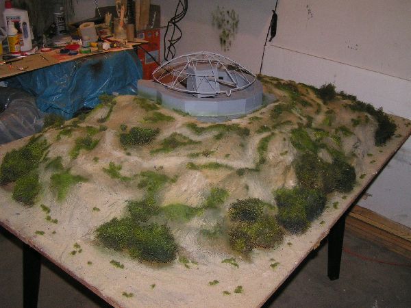 W tym czasie Sokol pracował nad wejściem do bunkra wraz ze schodami. Użył płytek polistyrenowych różnej grubości i ogromnych ilości kleju. Kiedy wszystkie elementy zostały zrobione i przyklejone na swoich miejscach można było zająć się wykonaniem terenu wokół wejścia. Najpierw wizyta w sklepie: „Prosimy trzy opakowania plasteliny, lakier do włosów, trzy tubki Super Glue opakowanie suszonej pietruszki, koperku, bazylii i oregano”. Pani spojrzała na nas bardzo dziwnie, ale nie wnikała w temat, i dobrze zresztą. My mogliśmy pracować dalej. Przy pomocy plasteliny i kawałków polistyrenu ukształtowaliśmy teren wokół wejścia a nieśmiertelnym pyłem dla szynszyli i trawką uzyskaliśmy imitacje pisaku i trawy. Można było pomalować całe stanowisko. Użyłem do tego średnio szarej, dość gęstej farby Vallejo, która nanosiłem szerokim płaskim pędzelkiem tak aby uzyskać strukturę betonu. Następnie wykonaliśmy wszystkie