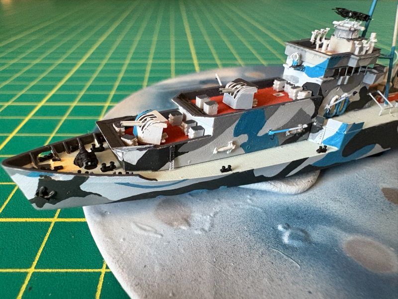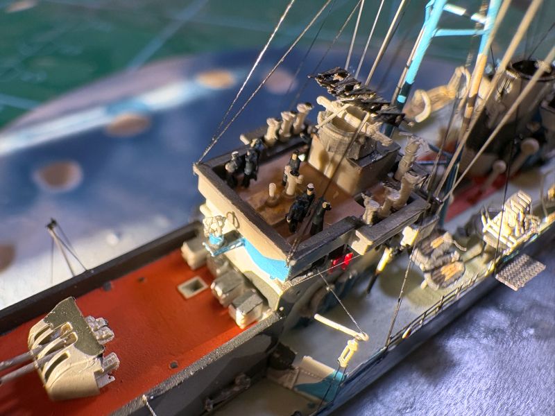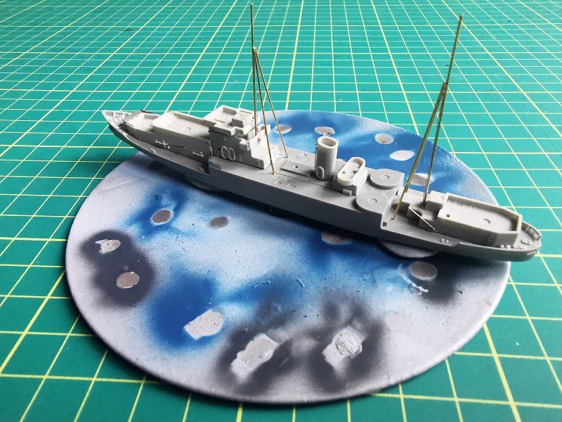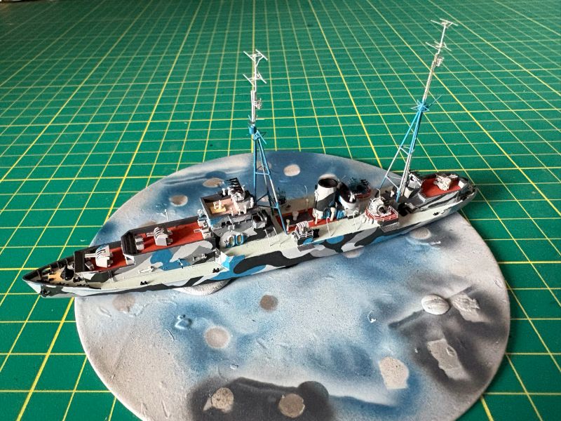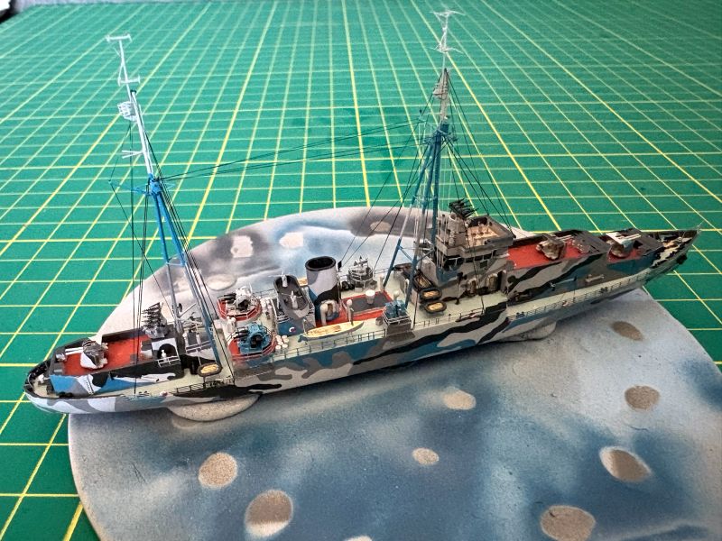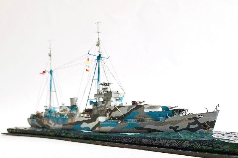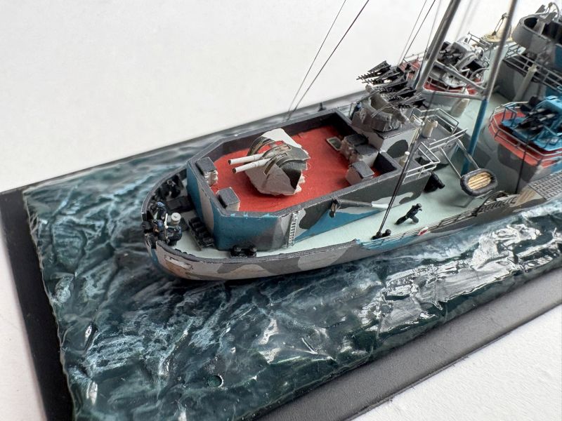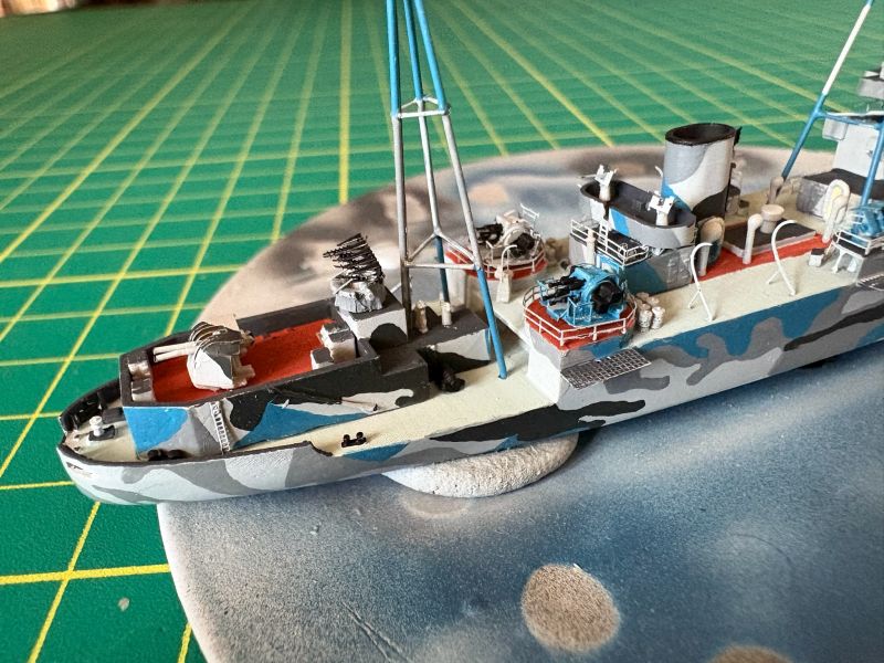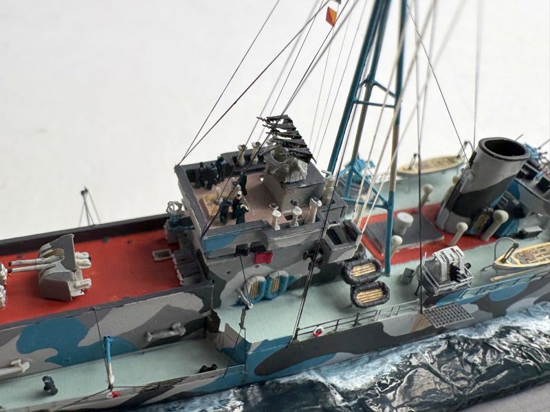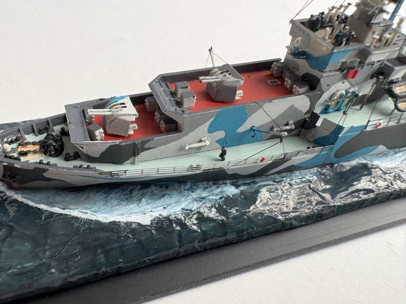 Po dokładnym wyschnięciu farby, mogłem odciąć figurki i delikatnie przykleić do różnych miejsc na pokładach okrętu. Obsadziłem pomost bojowy, zrzutnie bomb głębinowych i kilka miejsc na pokładzie. Przy budowie modelu wykorzystałem jeden wydruk, na którym było około 20 figurek. Zacząłem się też zastanawiać ile figurek trzeba wykorzystać przy budowie na przykład pancernika czy krążownika. Im większy okręt tym więcej figurek jest potrzeba. Jeden powinien wystarczyć na niszczyciel, raczej eskortowy. Krążownik to już dwa do trzech wydruków, zaś pancernik lub lotniskowiec to już cały zestaw i może być mało. Zamontowane figurki prezentowały się tak, jak to widać na powyższych zdjęciach.