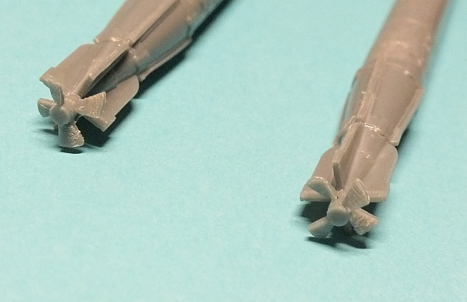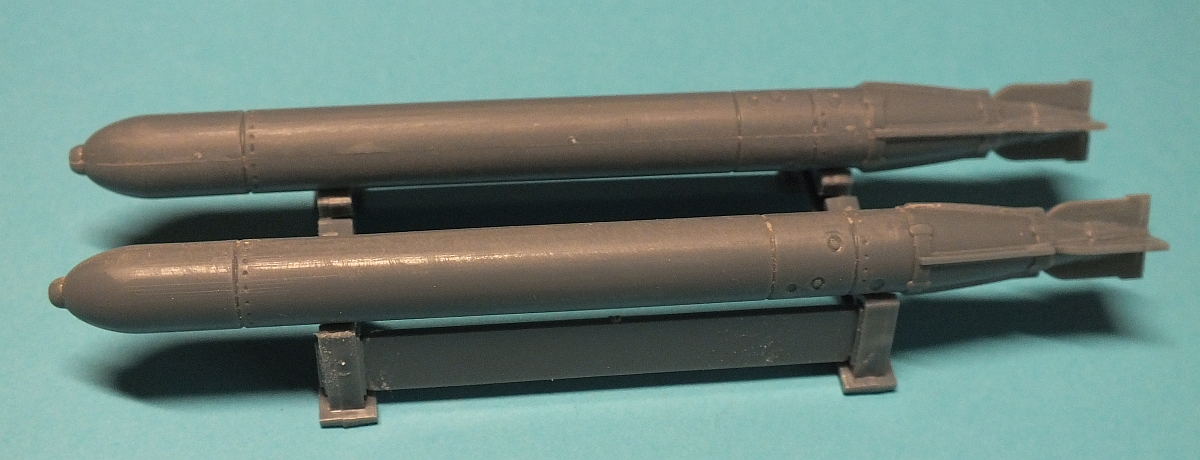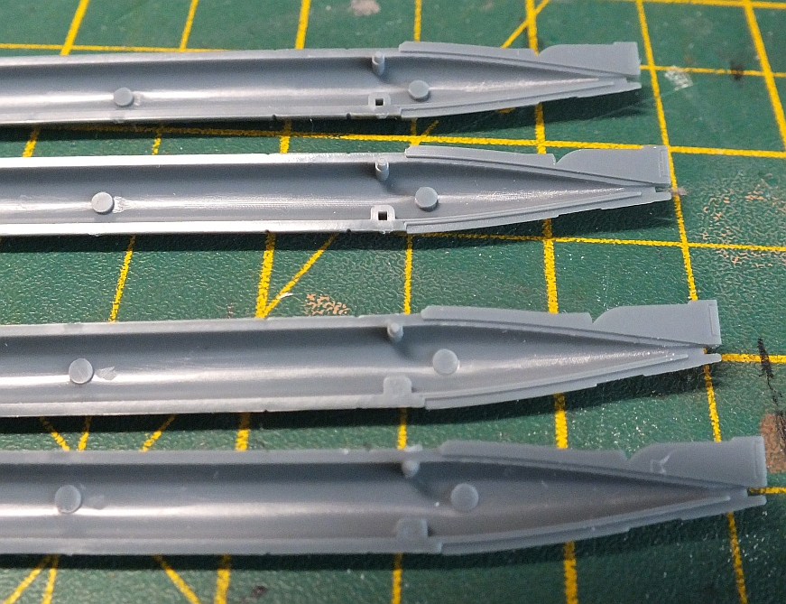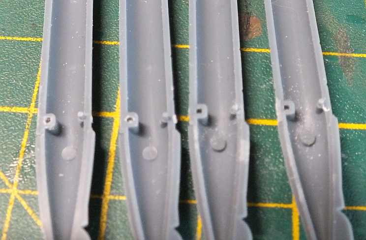 Następny etap, doklejenie prowadnic torped, czyli robota lekka, łatwa i przyjemna. Czego nie można powiedzieć o umocowaniu wsporników tychże – trochę sprytu trzeba. Można zauważyć,