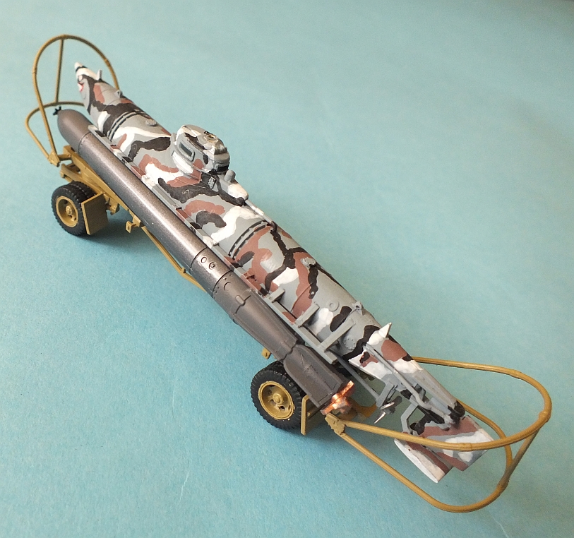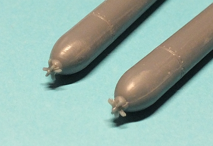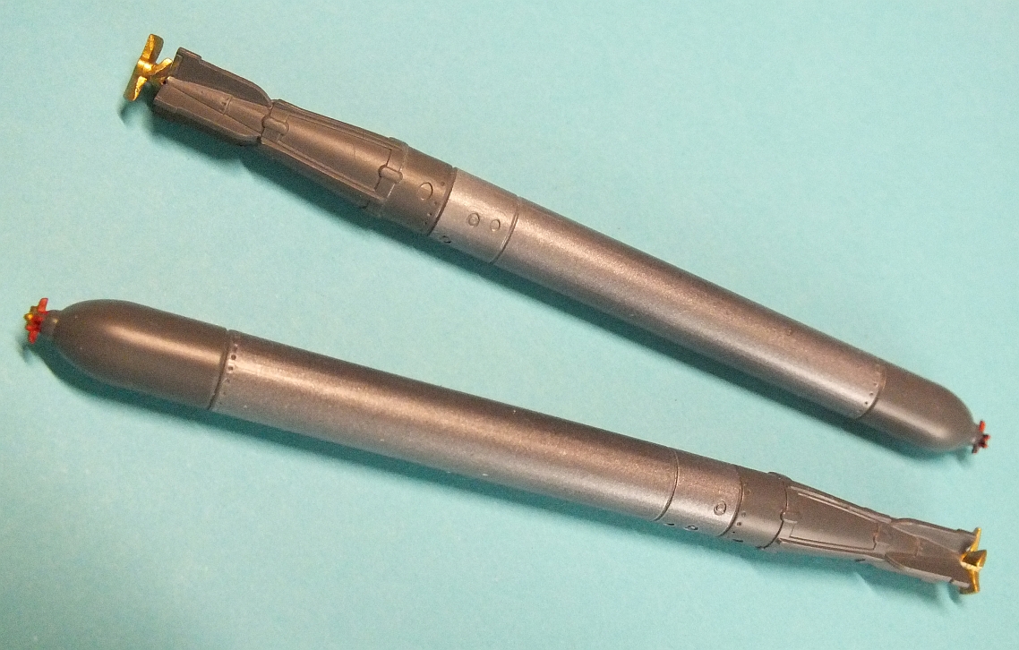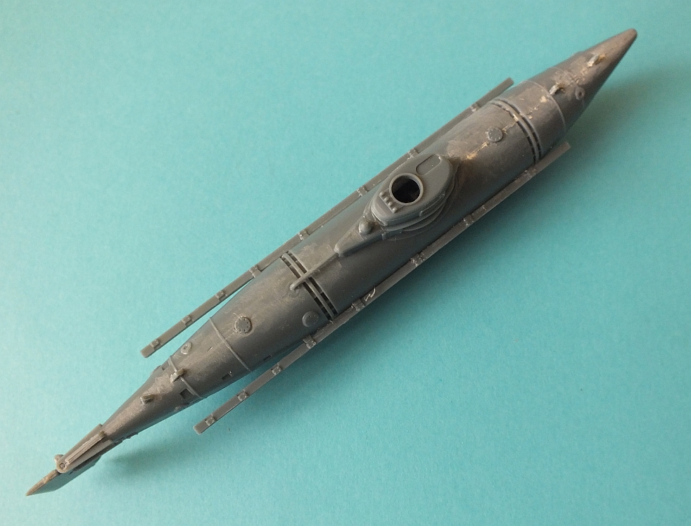 Następny krok, sklejenie połówek „cygar” i doklejenie „wąsów” zapalnika na dziobie oraz śrub napędowych na rufie . Zaczyna być groźnie…