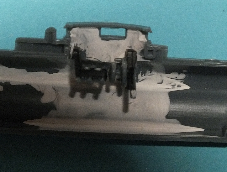 Dwie kolejne fotki przedstawiają ostatnią robotę na „wygnaniu”. Zmontowano peryskopy, wał napędowy, usterzenie i jego popychacze. Przy tej robocie dopiero zdałem sobie sprawę z tego, że wszystkie elementy do siebie pasują jak ulał. Prawie jak IBG, gdyby nie ta szpachla…