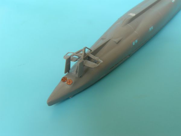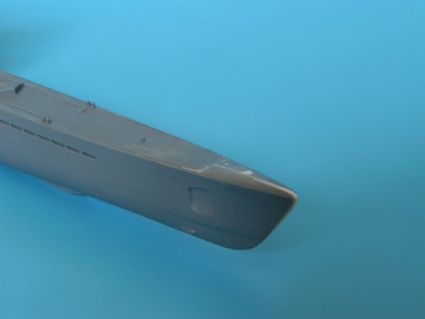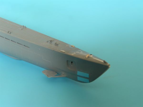 Kolejnym krokiem było uzupełnienie faktury kadłuba o linie podziału blach poszycia oraz szwy nitowe. Wykonałem ponadto imitacje pokryw wyrzutni torpedowych. Dziobowe to prostokąty wycięte z folii samoprzylepnej, rufowe zaś, to fototrawione detale jakie zostały mi po jednym z modeli. Z folii wykonałem również elementy na burtach w części podwodnej kadłuba.