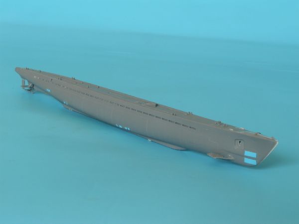 Po sklejeniu zasadniczych elementów modelu można było się zabrać za malowanie. Na początek wszystko zostało pokryte czarnym podkładem w sprayu, do tego posłużył mi zwykły lakier do zderzaków samochodowych. Zasadnicze malowanie to farby Vallejo Model Air – medium sea gray i czarny mieszane w różnych proporcjach – najbardziej ciemnym, antracytowym kolorem pokryłem podwodną część kadłuba, z niewielką domieszką czarnej pokryty został kiosk i uzbrojenie, zaś sam średnio szary posłużył do pomalowania nawodnej części kadłuba. Pokłady z kolei pomalowałem czarno zielonym z domieszką szarego.