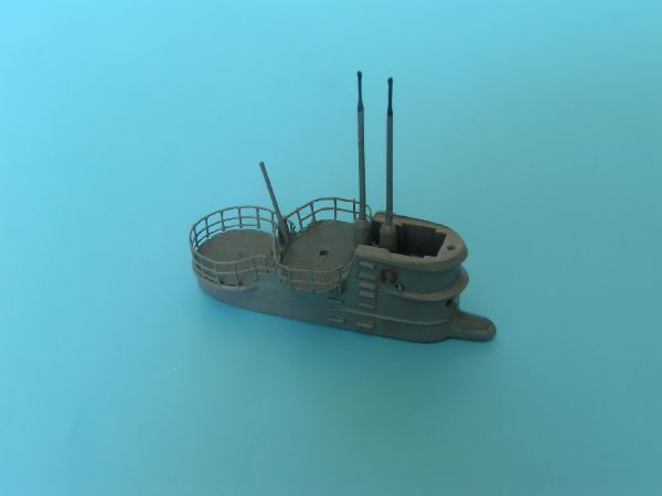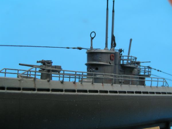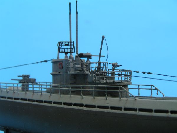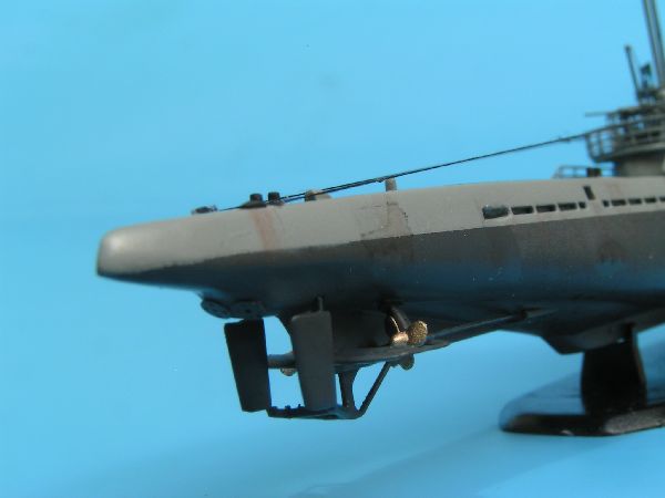Po wyschnięciu farby wkleiłem kiosk, śruby napędowe oraz wszystkie pozostałe drobne detale. Wykorzystałem śruby polistyrenowe, miały zdecydowanie lepszy kształt i wielkość niz forotrawione. Uzbrojenie uzupełniłem o kilka drobnych części, takich jak imitacje celowników w przypadku działa 8,8cm czy magazynków w przypadku działek p.lot. Do wykonania olinowania posłużyły mi nitki z damskich rajstop, zaś izolatory to krople płynnej szpachlówki Gunze, które pomalowałem po wyschnięciu pomalowałem kolorem czarno – zielonym.