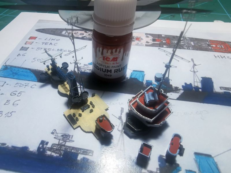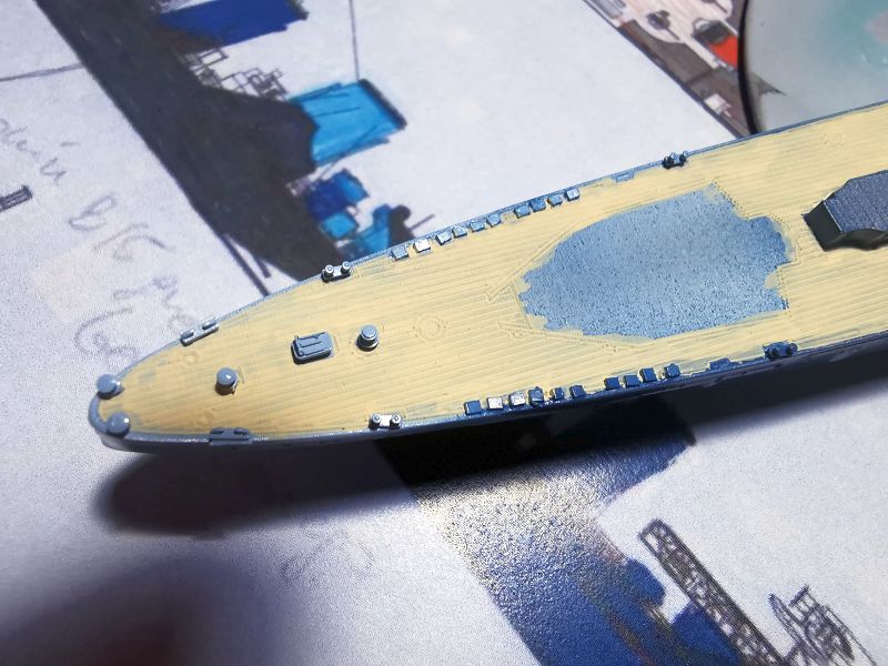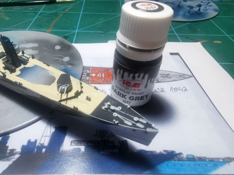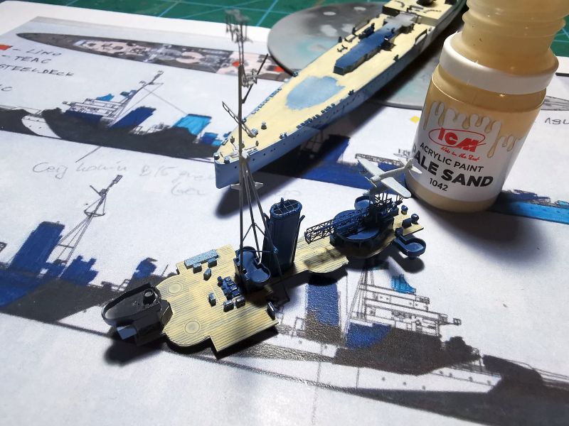 Tak też model został pomalowany. Do wymalowania kamuflażu użyłem lakierów modelarskich firmy Bilmodel. Tym razem wszystkie kolory naniosłem przy pomocy aerografu, co wymagało dokładnego maskowania poszczególnych sekcji modelu przy pomocy kawałków taśmy maskującej. Dom malowania pokładów użyłem farb akrylowych firmy ICM. Pierwszy kontakt z nimi miałem przy okazji budowy modelu lotniskowca eskortowego HMS „Amastra”, ale tam ograniczyło się do użycia tylko jednego koloru. Tu tych kolorów było użytych aż trzy. Farby ukraińskiego producenta przypominają mi nieco akryle włoskiej firmy Misterkit. Buteleczki napełnione mniej więcej do trzech czwartych dość gęstą farbą. Rozcieńczamy wedle uznania, jak nam pasuje. Drewniane pokłady malowałem dość gęstą farbą, którą nakładałem cienkim pędzlem wzdłuż deskowania. Dzięki temu uzyskałem zróżnicowanie natężenia koloru bazowego. Pokłady stalowe oraz pokryte linoleum malowałem już farbami mocniej rozcieńczonemu. Ciemno szarego używałem już wcześniej przy okazji klejenia „Amastry”, zaś czerwono brązowej farby, którą producent dedykował do malowania podwodnych części kadłubów, czyli „Hull Red” używałem po raz pierwszy. Kolor ten idealnie oddaje kolor linoleum, więc warto o tym pamiętać. Farby ICM po raz kolejny zdały egzamin, ale „szkoła ognia” czyli malowanie kamuflażu jeszcze przed nimi.
