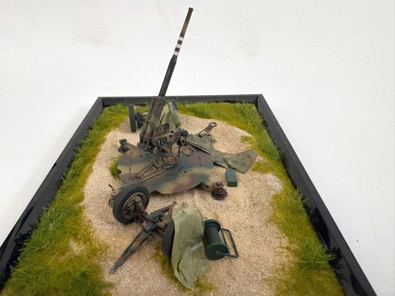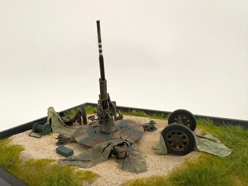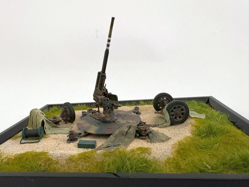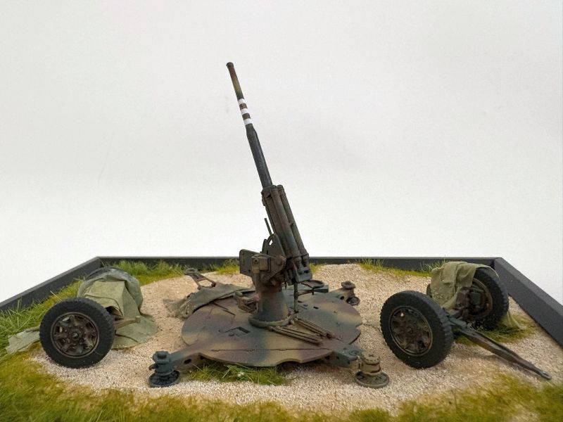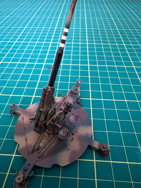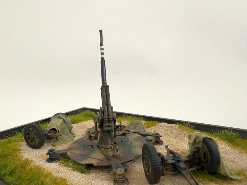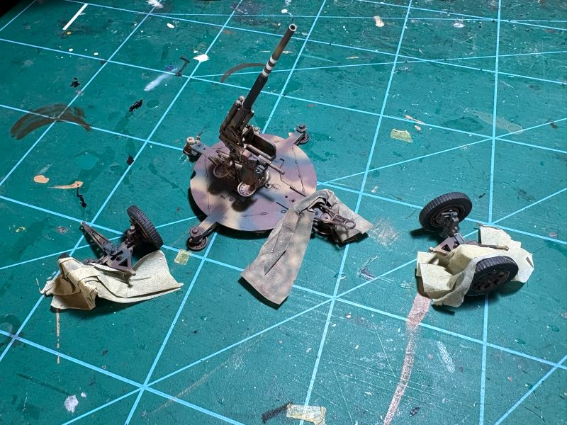 Moja armata finalnie miała trafić na podstawkę. Zanim to jednak nastąpiło postanowiłem „wyposażyć” ją jakieś plandeki i siatki maskujące. Inspirowałem się ilustracją na pudełku. Użyłem do tego chusteczki higienicznej. Dokładniej pojedynczej warstwy papieru z takiej chusteczki. Przy pomocy aerografu pomalowałem ja odpowiednimi kolorami. Plandeki otrzymały jednolitą barwę, siatki w kamo. Po pocięciu ich w odpowiedniej wielkości kawałki uformowałem je a następnie umieściłem na podstawie armaty i wózkach. Przyklejałem je punktowo klejem CA, starając nanosić klej w niewidocznych miejscach.