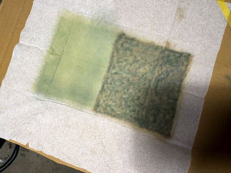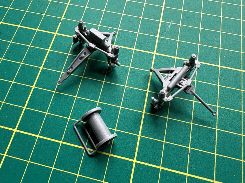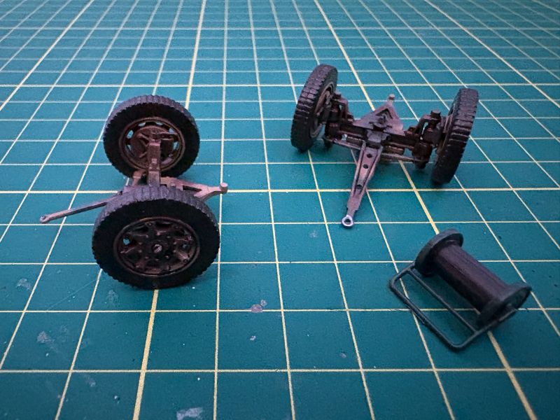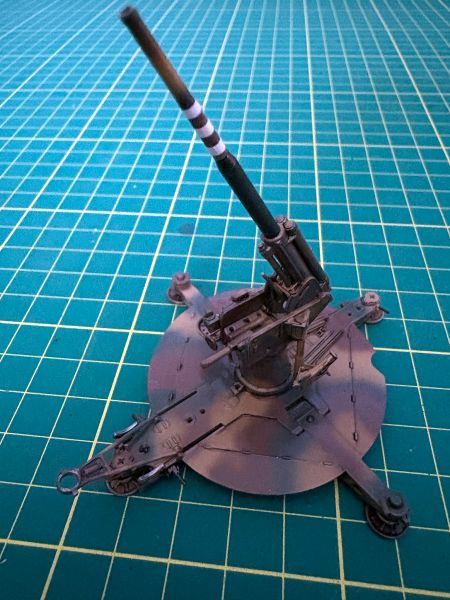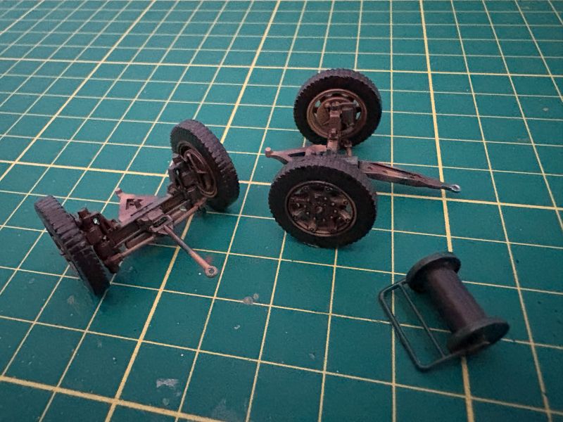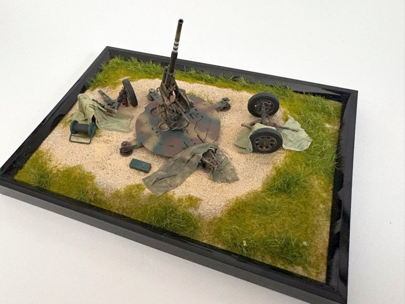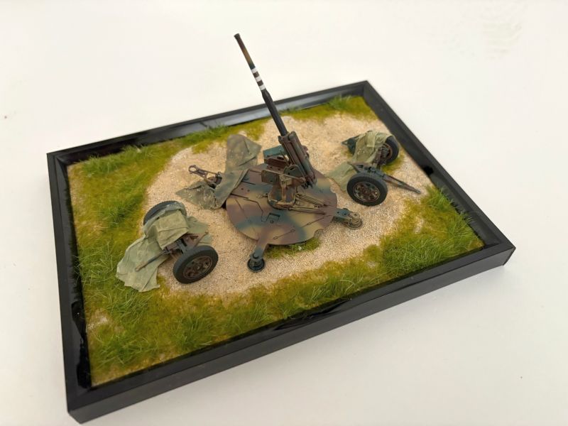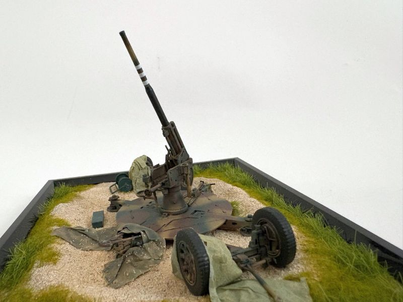 Moja armata finalnie miała trafić na podstawkę. Zanim to jednak nastąpiło postanowiłem „wyposażyć” ją jakieś plandeki i siatki maskujące. Inspirowałem się ilustracją na pudełku. Użyłem do tego chusteczki higienicznej. Dokładniej pojedynczej warstwy papieru z takiej chusteczki. Przy pomocy aerografu pomalowałem ja odpowiednimi kolorami. Plandeki otrzymały jednolitą barwę, siatki w kamo. Po pocięciu ich w odpowiedniej wielkości kawałki uformowałem je a następnie umieściłem na podstawie armaty i wózkach. Przyklejałem je punktowo klejem CA, starając nanosić klej w niewidocznych miejscach.