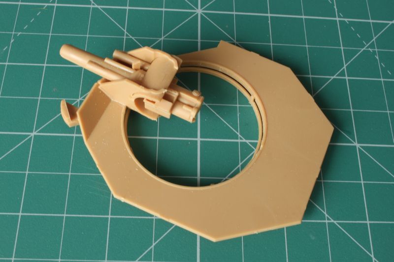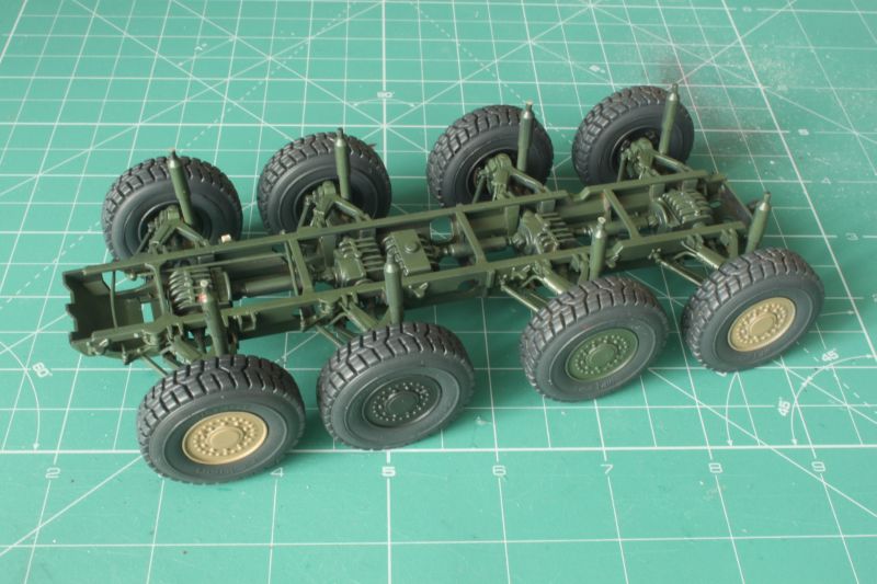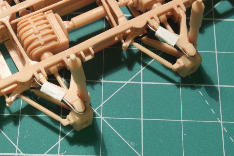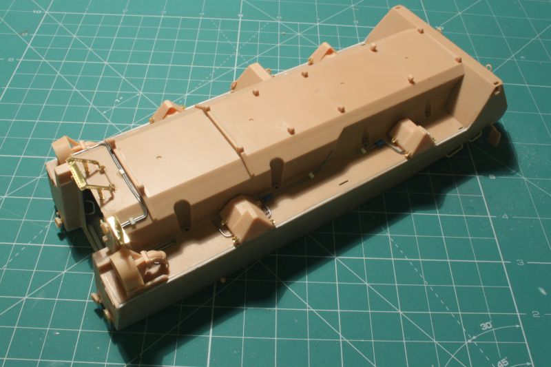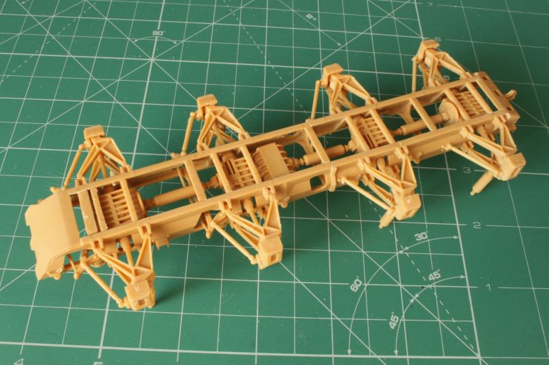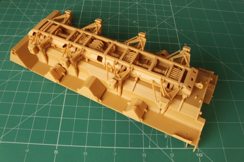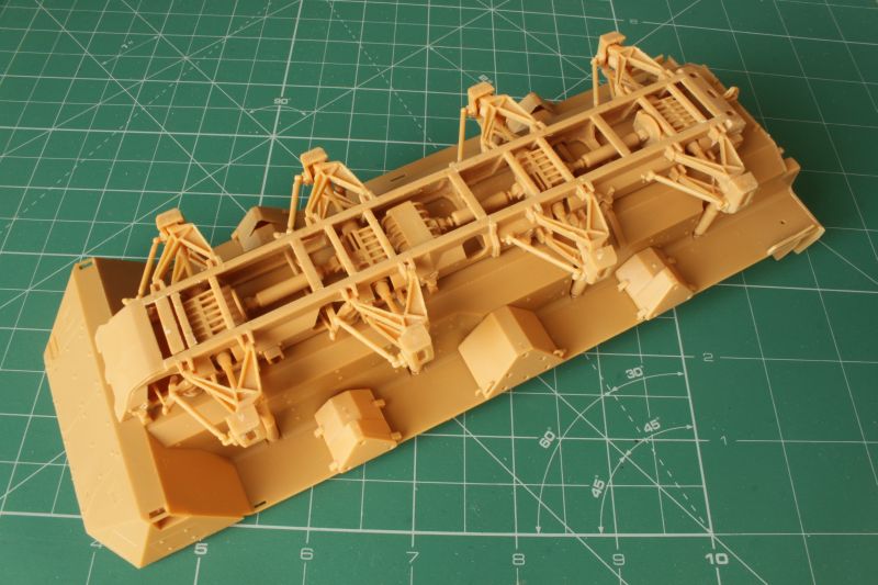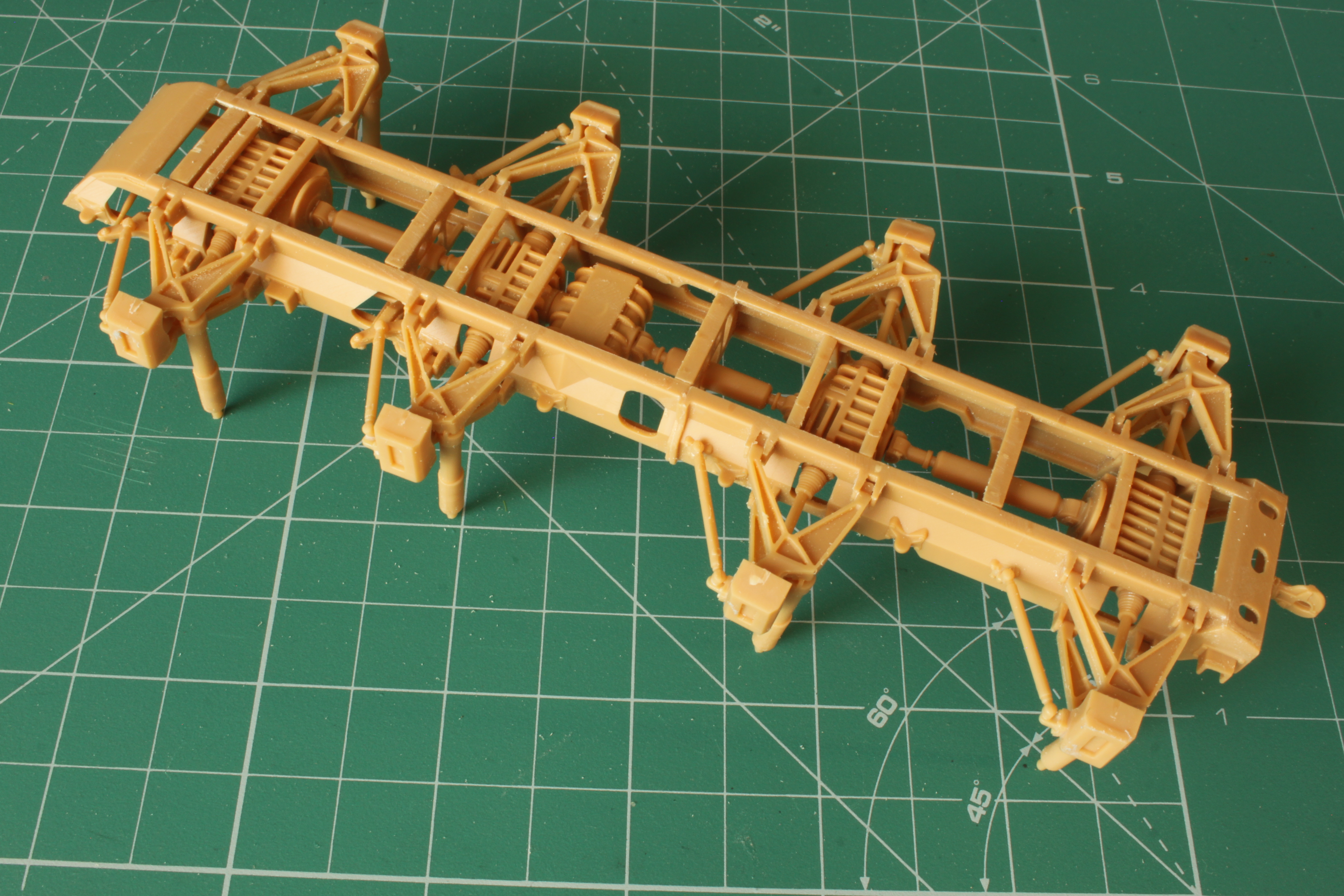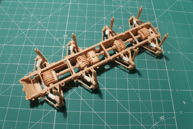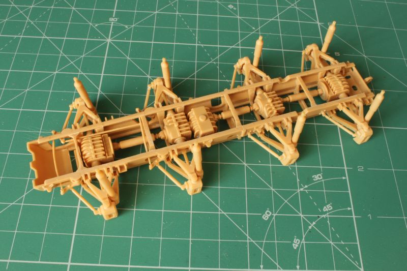 Na pierwszy ogień poszła rama pojazdu, i pierwsze miłe zaskoczenie. Ten skomplikowany i składający się ze sporej liczby elementów moduł, złożył się bez najmniejszego problemu, a klej był potrzebny jedynie, aby wszystko trzymało się kupy. Ramę uzupełniłem o imitacje przewodów hamulcowych wraz z osłonami. Oczywiście poprawność spasowania ramy, przez cały czas kontrolowałem przykładając ramę do wanny kadłuba.