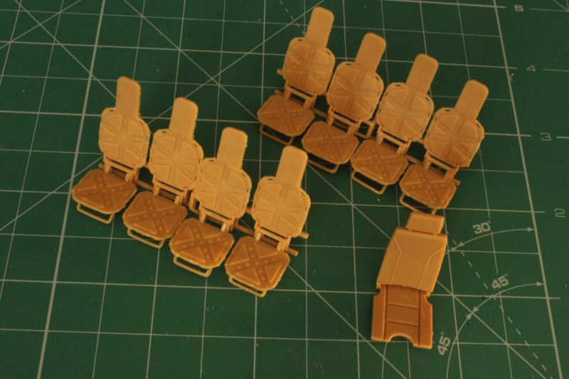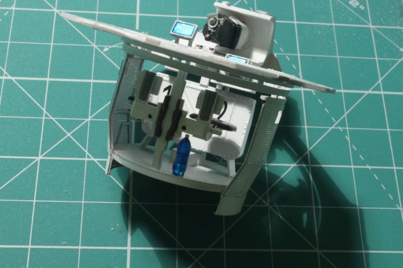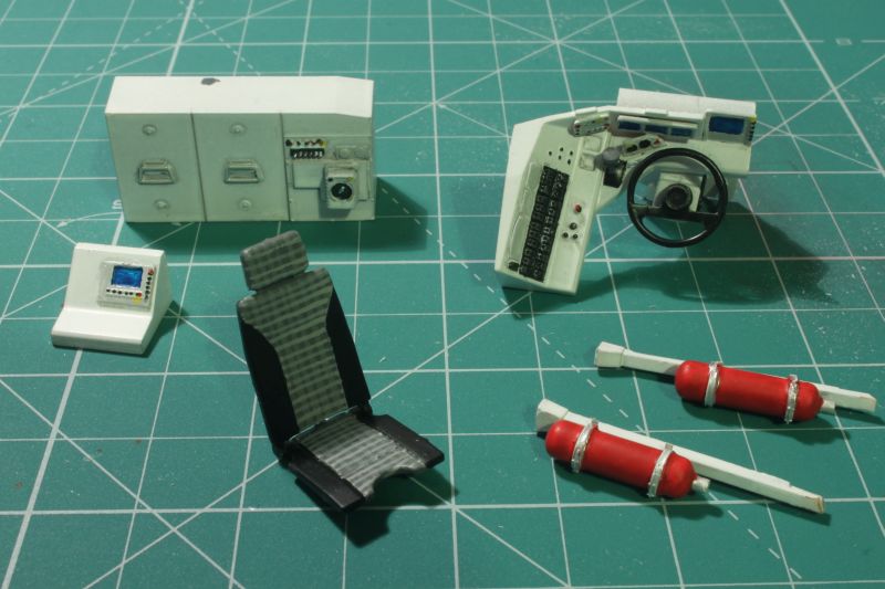 Mając gotowe wszystkie elementy wnętrza mogłem zabrać się za jego pomalowanie. Korzystałem głównie z farb akrylowych krajowej Hataki, a dokładnie z produktów z serii Red Line i Blue Line. Z efektu jestem bardzo zadowolony. Trzeba jednak zaznaczyć, że do malowania aerografem należy je rozcieńczyć do konsystencji mleka. Potem malowanie jest bezproblemowe. Aerografem nanosiłem podstawowe kolory wnętrza, czyli biały oraz szary. Ponieważ nie miałem białego z Hataki, użyłem Vallejo. Nie wiem natomiast co się stało, czy jakość Vallejo pogorszyła się, czy też jakość Hataki jest tak dobra, ale lepiej malowało mi się ta ostatnią. Zaznaczam, że nie jest to żadna forma przypodobania się komukolwiek, ale tak się stało. Vallejo schła znacznie dłużej, miała później nieprzyjemną gumowatą powierzchnię, podczas, gdy Hataka po wyschnięciu była idealnie matowa i bardzo dokładnie oddała wszystkie pokryte nią detale.