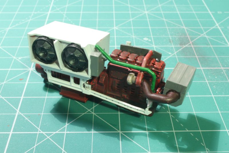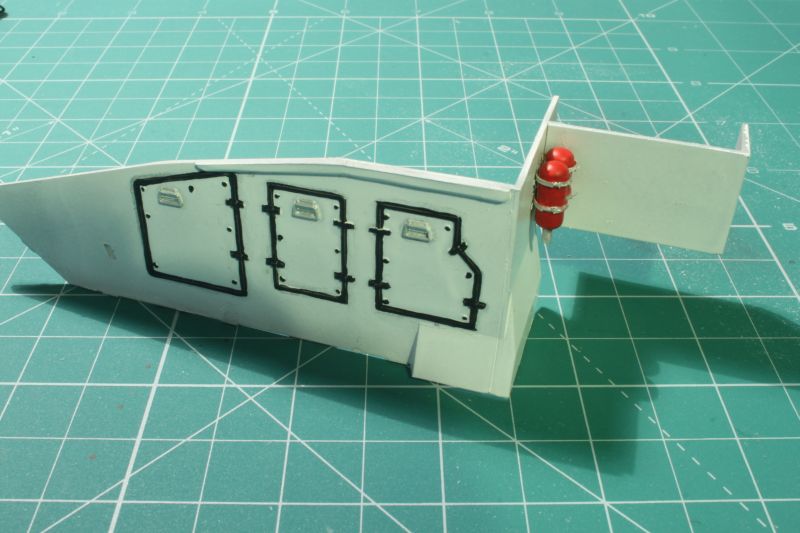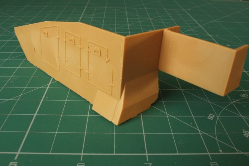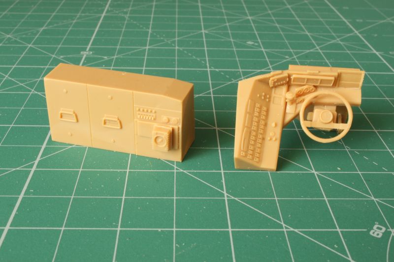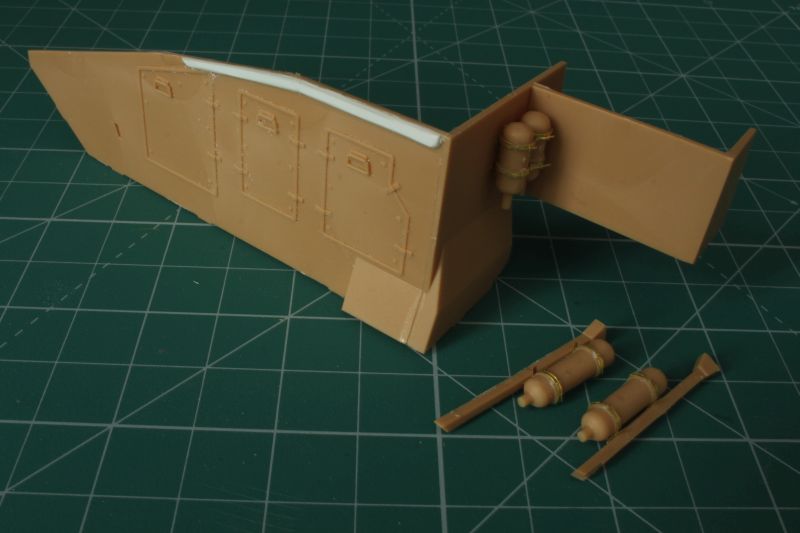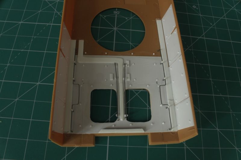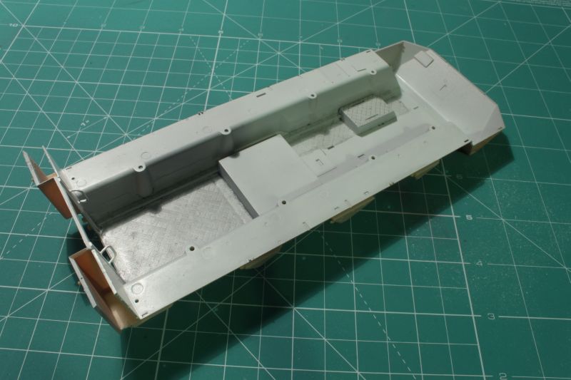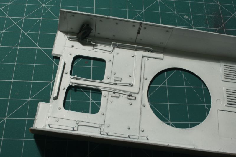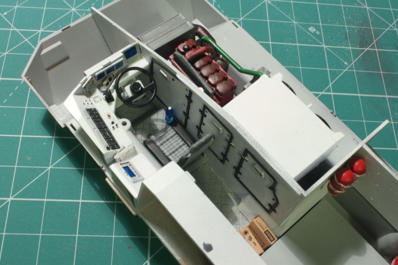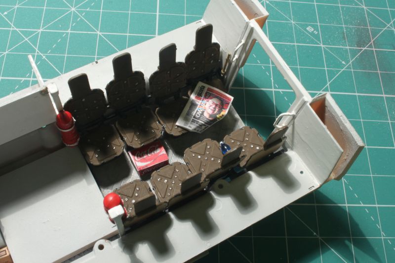 Postanowiłem nie ograniczać się jedynie do tego, co oferuje zestaw i dodatki. We własnym zakresie odtworzyłem strukturę burt i sufitu przedziału desantowego. W przedziale kierowcy dodałem osłonę przewodu od klimatyzacji. Do tego celu wykorzystałem płytki polistyrenowe o różnej grubości, profile i drut.