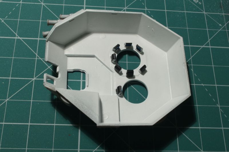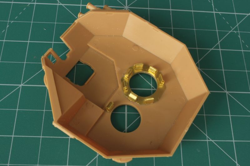 Kolejnym etapem prac było wykonanie wszystkiego, co należy umieścić we wnętrzu kadłuba i wieży. A jest tego naprawdę sporo – silnik, przedział kierowcy, przedział desantu, kosz wieży… Zacząłem już wtedy montować pierwsze fototrawionki – dolne części peryskopów wieżyczki, uchwyty gaśnic oraz kosz wieży. Ten ostatni otrzymał również szkielet wykonany z cienkiego drutu.