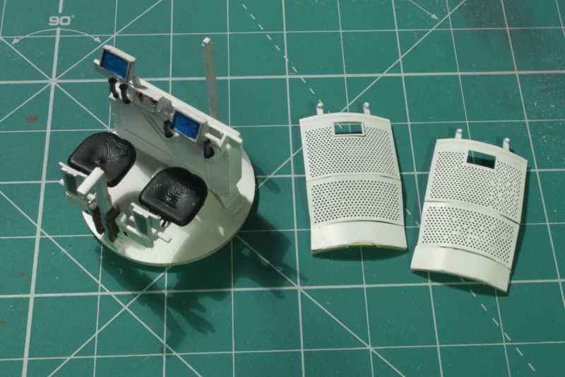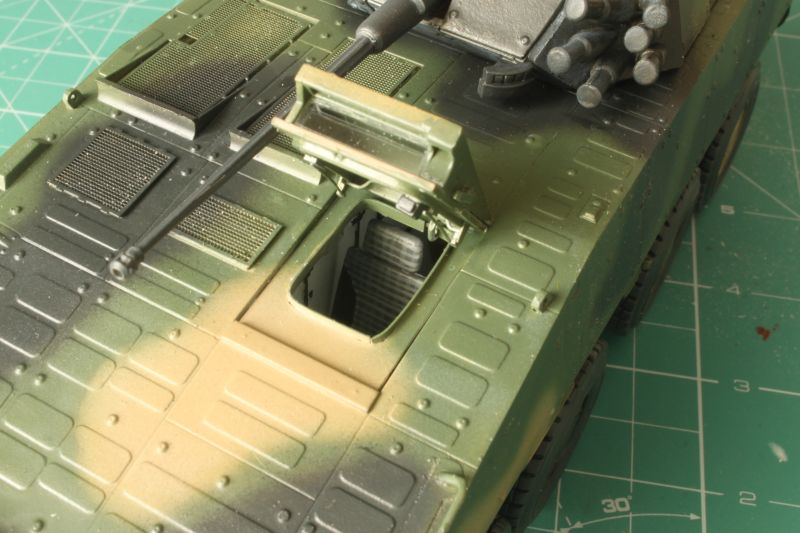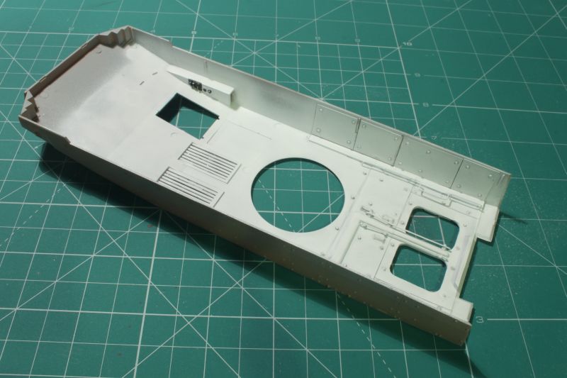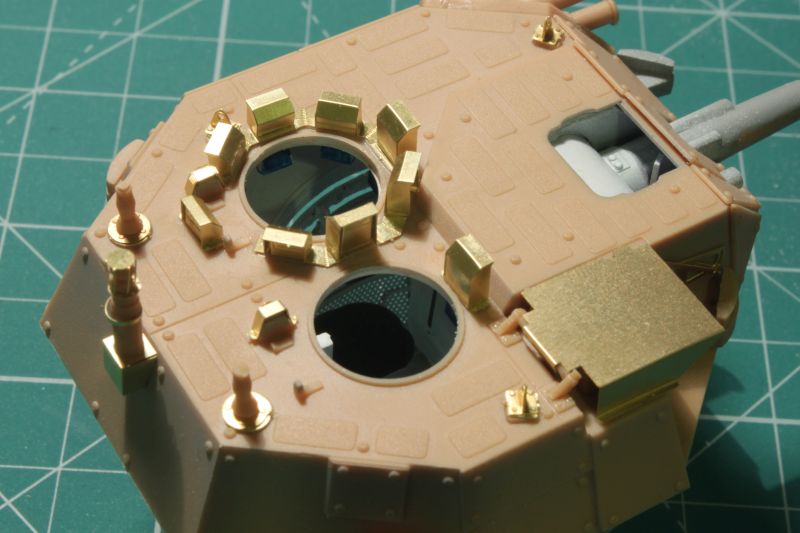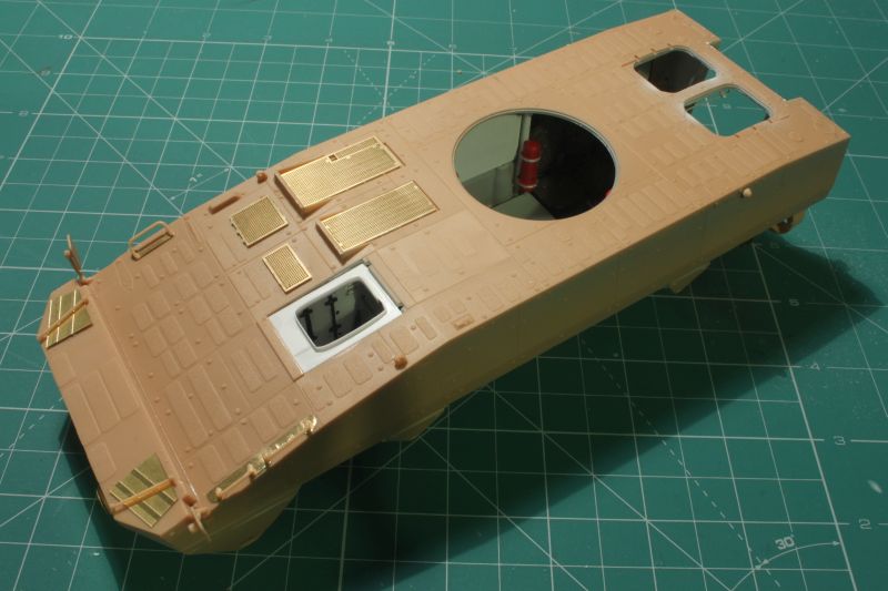Na zastosowaniu blaszek fototrawionych zyskała również wciągarka oraz włazy. Postanowiłem wkleić je dopiero po pomalowaniu modelu. Ponieważ właz kierowcy postanowiłem pozostawić w pozycji otwartej, musiałem odtworzyć jego konstrukcję wewnętrzną. Sklejenie go w całość również możliwa była po pomalowaniu z powodu szyby którą trzeba było wkleić od środka.