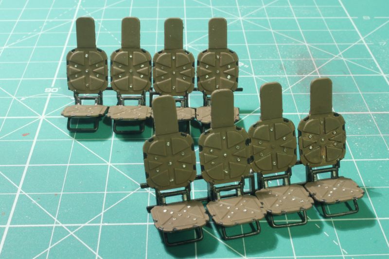 Podobnie było z detalami malowanymi pędzlem przy użyciu farb Blue Line. Przy delikatnym rozcieńczeniu i odrobinie wprawy można osiągnąć naprawdę znakomite efekty – ślady po pędzlu są praktycznie niewidoczne. Ostatnim zabiegiem przed zmontowaniem wnętrza w całość był ciemno szary wasch, który zapuściłem w ryflowane płyty na podłodze oraz w linie pomiędzy poszczególnymi panelami na suficie i ścianach bocznych przedziału desantu.