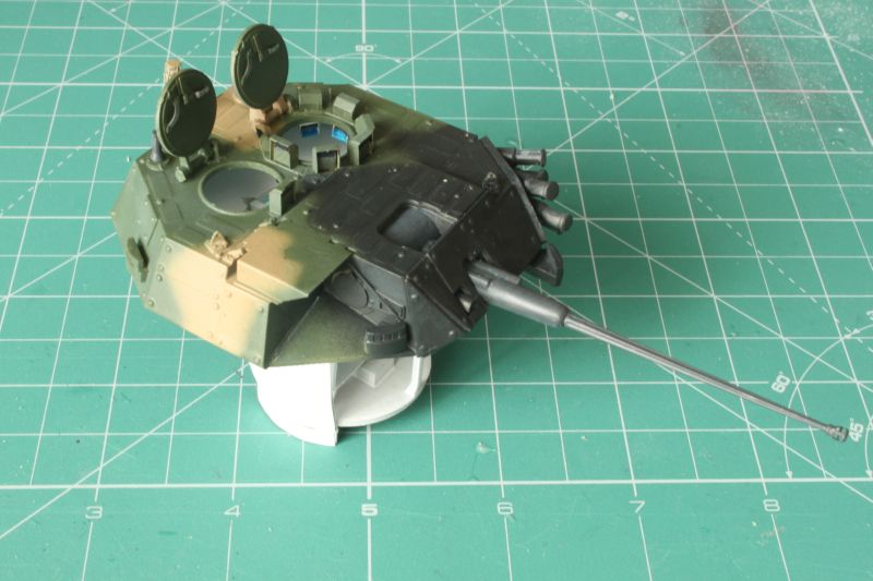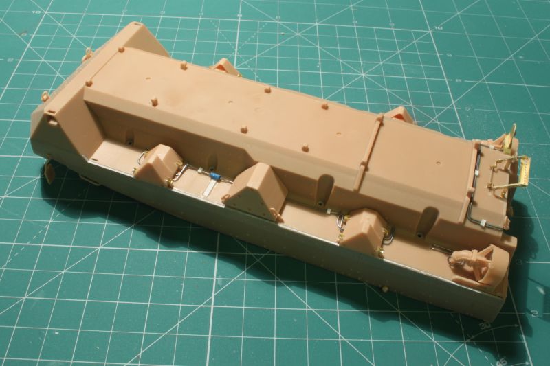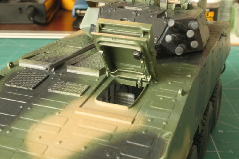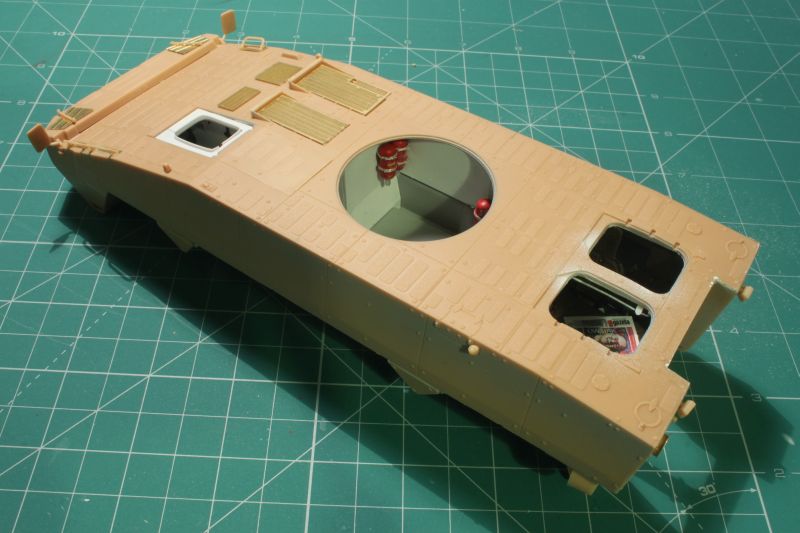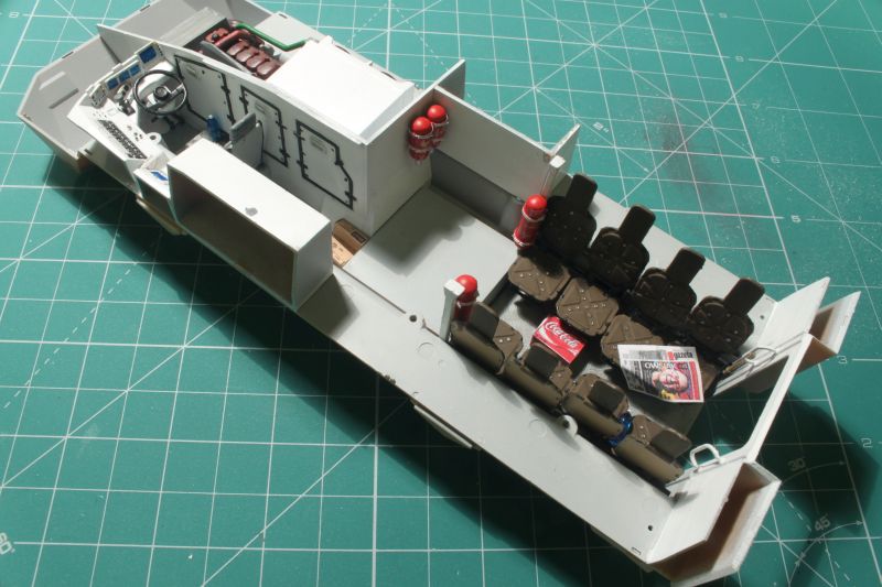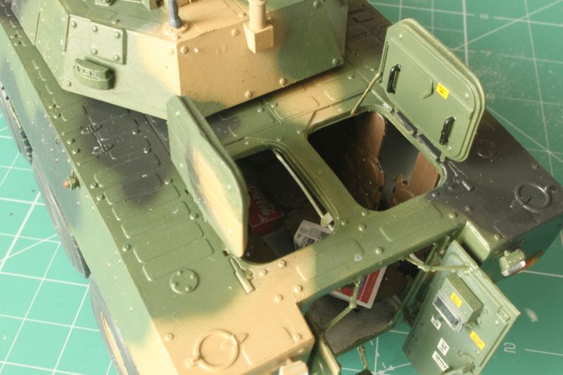 Umieszczenie poszczególnych podzespołów w kadłubie i wieży nie stanowiło poważniejszych problemów, wszystko było doskonale z sobą spasowane. Musiałem tylko skorygować położenie kilku elementów wykonanych we własnym zakresie, bo się kadłub nie chciał zamknąć. Zanim to jednak zrobiłem, dodałem kilka rzeczy, które często można spotkać w pojazdach wojskowych, a które znakomicie ożywiają budowane modele, a więc leżąca w przedziale desantu gazeta, butelki z wodą mineralną, złożona mapa w przedziale kierowcy, kurtki moro, kartony itp. Pracy niewiele, bo butelki miałem gotowe z zestawu Menga, kartony i mapy wcześniej opracował Kolega, gazetę „ściągnąłem” z netu pomniejszyłem i wydrukowałem, jedynie moro musiałem wymalować własnoręcznie. Osiągnięty efekt był znakomity. Cały ten „dobytek” poumieszczałem w takich miejscach, żeby było je widać przez otwarte włazy. Na sam koniec jedna uwaga, jeżeli komuś mocno zależy na tym, aby wieża mogła obracać się, musi zestawowe gaśnice zastąpić mniejszymi, wklejone według instrukcji uniemożliwiają pełen obrót wieży.