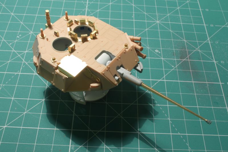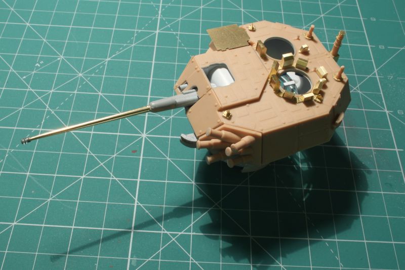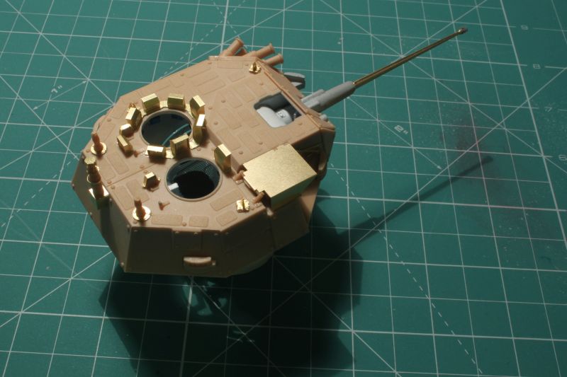 Mogłem zatem skleić w całość kadłub modelu i wieżę. Po obróbce miejsc łączenia, a było tego naprawdę niewiele, zająłem się dalszym uzbrajaniem modelu w fototrawione blaszki. W pierwszej kolejności wykorzystałem te z zestawu, a dopiero w dalszej kolejności, te z Parta. Obu zestawach można powiedzieć, że są znakomitej jakości. Dobrze zaprojektowane, łatwo się wyginają i formują. Początkowo trochę sceptycznie byłem nastawiony do peryskopów, ale już po złożeniu pierwszego uznałem, że to znakomity pomysł. Nie da się jednak tego powiedzieć o elementach, które trzeba zwijać w walec. Blaszki są zbyt sztywne i po kilku próbach odpuściłem wykorzystując elementy zestawowe. Bardzo dobrze prezentuje się natomiast metalowa lufa z Mastera, a ażurowy tłumik to mistrzostwo świata. Od siebie dodałem natomiast przewody pędników oraz instalacji umieszczonej pod błotnikami. Po raz kolejny poszedł w ruch drut cynowy, kawałki polistyrenu i resztki izolacji przewodów elektrycznych.