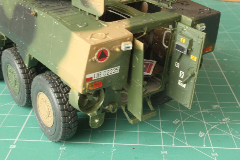 W ten sposób dotarłem do najważniejszego etapu całego projektu czyli malowania. Początkowo miałem malować model akrylami z Hataki, ale w między czasie firma ta wypuściła na rynek nową linię produktów, lakiery celulozowe i namówiono mnie na ich przetestowanie. Winowajcą był jeden z dystrybutorów tych farb – firma Arma Hobby. Hataka oferuje dwa zestawy farb do malowania pojazdów NATO, w tym i polskich. Jak wspomniałem wcześniej są to zarówno farby akrylowe Red Line jak i lakiery celulozowe Orange Line. Teoretycznie obie linie produktów są przeznaczone do malowania aerografem, w praktyce należy je rozcieńczyć. Zanim jednak zabrałem się za malowanie, musiałem model do niego przygotować. W moim wypadku było to zabezpieczenie wnętrza i pokrycie modelu podkładem w sprayu. Podkład to w moim przypadku reguła bez względu na typ farby i zapewnienia producentów. Różnica pomiędzy Rosomakiem a innymi moimi modelami polegała na zastosowaniu dwóch rodzajów podkładu. Ramę i koła pokryłem czarnym podkładem z Chaos Black z Vallejo, zaś cała reszta potraktowana została produktem Surfacer Primer z Tamiyi. Po wyschnięciu podkładu zacząłem nanosić poszczególne kolory kamuflażu, według schematu zmodyfikowanego w 2014r. Postepowania z każdym nowym produktem trzeba się nauczyć, poznać jego właściwości, dobrać konsystencję, ciśnienie w kompresorze, ustawienia aerografu. Tak było również z nowymi lakierami Hataka. Opracowanie technologii malowania nie zajęło mi specjalnie dużo czasu, a samo naniesienie na model dość skomplikowanego przecież trójkolorowego kamuflażu zajęło mi jeden wieczór. Malowałem bez użycia szablonów, co zdarza mi się dość rzadko. Tym razem jednak z efektu jestem zadowolony. Lakiery kładły się cienką warstwą, ale drobne niedociągnięcia w przygotowanej powierzchni potrafią wybaczyć. Nie było chlapania, kropienia czy innych niespodzianek tego typu, a przejścia jednego koloru w drugi wyszły delikatnie i płynnie. Wszystkie poprawki, jakie ujawniły się po zakończeniu malowania wykonałem przy pomocy akrylowych odpowiedników zastosowanych lakierów. Z zadowoleniem stwierdziłem, że po wyschnięciu nie widać różnicy. Żadnej. Ostatnią czynnością było porycie modelu matowym werniksem, ponieważ lakiery Hataka mają półbłyszczące wykończenie.