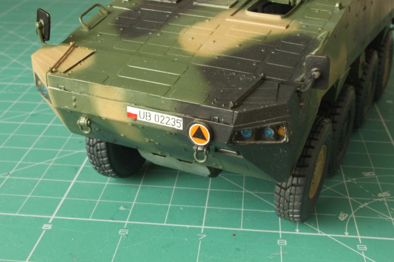 Opony, armatę oraz wszelkiego rodzaju drobiazgi pomalowałem pędzelkiem i mogłem zając się składaniem Rosomaka w całość. Przykleiłem koła do ramy, skleiłem w całość właz kierowcy, wraz z innymi włazami umieściłem na swoich miejscach w modelu. Na tym etapie na swoim miejscu znalazły się reflektory, światła i inne przezroczyste elementy. Trochę je podrasowałem przy pomocy odpowiednich farbek o transparentnej fakturze. Na samym końcu z kawałka cienkiego drutu zrobiłem antenę, która ozdobiłem proporczykiem wykonanym z kawałka kalkomanii.
