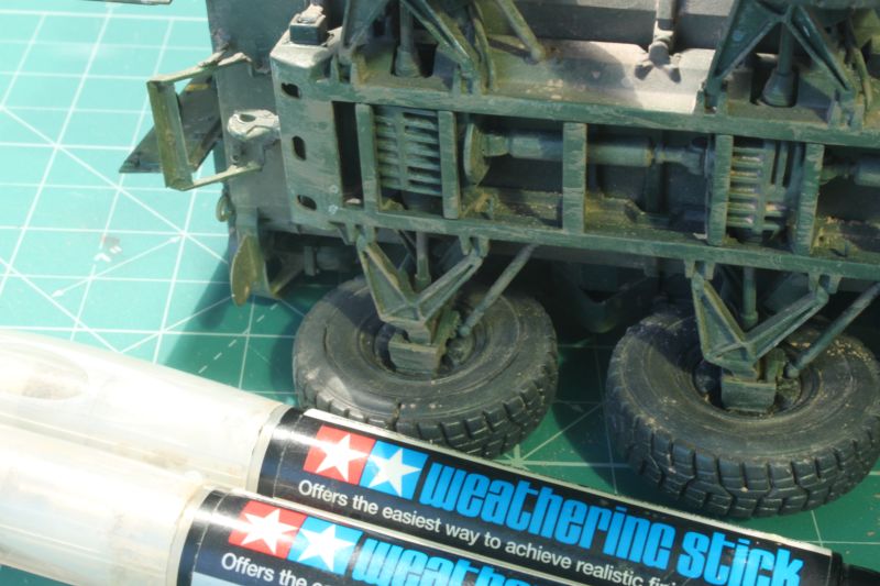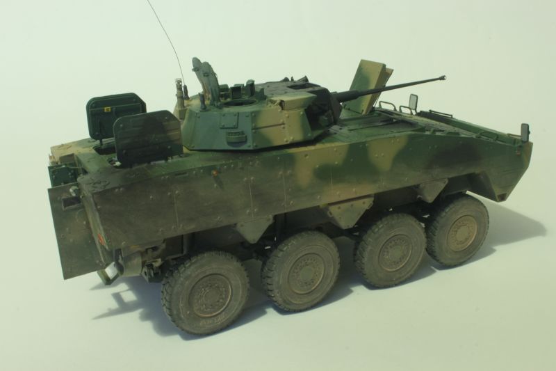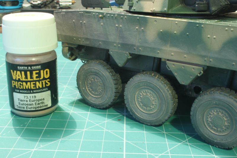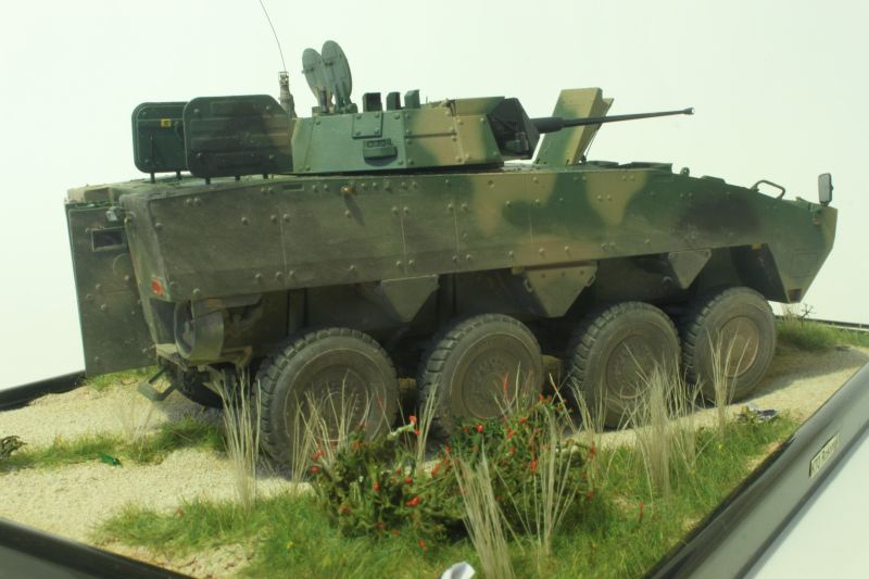 Większość modeli, zwłaszcza pojazdów bojowych powinna mieć zaznaczone ślady eksploatacji. Co do tego nie ma wątpliwości, bez dwóch zdań dodaje to realizmu budowanym replikom. Jednak jestem zdecydowanym przeciwnikiem artystycznego brudzenia przy pomocy bardzo zaawansowanych technik. Przyznaję, nie umiem w większości ich stosować, i co więcej nie zamierzam się ich uczyć. Widziałem modele okrętów klejone przez speców od artystycznie brudzonej broni pancernej. Efekt był tragiczny, modele pięknych okrętów wojennych w okresie świetności swojej służby wyglądały jak wraki oczekujące na swój kres w stoczni złomowej, na plaży, gdzieś w Bangladeszu. W przypadku Rosomaka postanowiłem zastosować odwrotną taktykę i model pojazdu bojowego pobrudzić według reguł stosowanych w modelarstwie okrętowym. Czyli brudzę tak jak widzę na zdjęciach. Ze zdjęć jakimi dysponowałem, najbardziej podobały mi się te wykonane przez Wojtka w Krojantach, przy suchej pogodzie, gdzie pojazdy były tylko delikatnie pokryte pyłem ze ścierniska po którym jeździły. Tak też postanowiłem potraktować moją replikę. Na początek cienkim pędzelkiem i srebrną farbą w kilku miejscach wykonałem delikatne odpryski farby. Potem przy pomocy pisaków Tamiyi, naniosłem ślady błota na podwoziu pojazdu. Ostatnia czynnością było pokrycie modelu kurzem, do wykonania którego zastosowałem suchy pigment Vallejo. Spora jego warstwa pokryła boczne powierzchnie kół i podwozie pojazdu. Powierzchnie boczne i tylne zostały przykurzone tak jak zaobserwowałem na zdjęciach oryginału.
