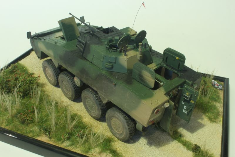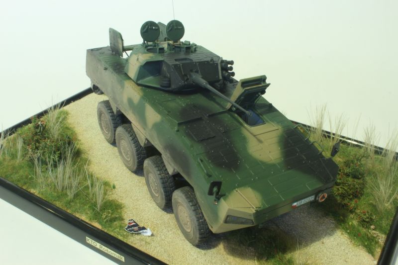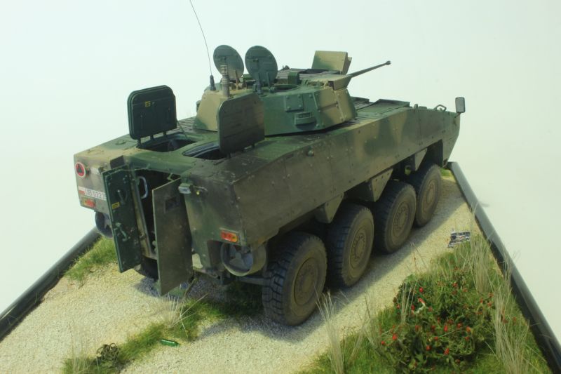 Gotowy model tradycyjnie wyeksponowałem na podstawce imitującej fragment terenu. Początkowo miała to być brukowana ulica, potem ściernisko, ostatecznie jednak otrzymała formę polnej drogi obrośniętej suchą trawą i krzewami dzikiej róży. Aby nadać jej nieco życia umieściłem na niej kilka elementów cywilizacyjnych – porwany karton, śmieci i puste butelki opróżnione przez jakiś lokalnych koneserów. Budowa trwała około miesiąca czasu i muszę stwierdzić, że był to bardzo miło spędzony czas. Model Rosomaka z IBG Models jeśli chodzi o koncepcję i opracowanie to najwyższy światowy standard. Zresztą modele tego producenta w którymi wcześniej miałem do czynienia kleiły się bezproblemowo, tak było i tym razem. Cieszę się z tego, że mamy w kraju kolejnego producenta oferującego doskonałe farby. Dotychczas korzystałem z oferty producentów zagranicznych, do czasu pojawienia się doskonałych lakierów Bilmodela. Teraz mam do dyspozycji bardzo szeroką ofertę farb i lakierów od krajowych producentów, która praktycznie w 100% pokrywa zapotrzebowanie modelarzy na farby każdego rodzaju. Obok produktów Bilmodela na moim warsztacie na stałe zagościła Hataka i nic nie wskazuje na to, że się to w przyszłości zmieni. W przyszłości natomiast, na moim warsztacie na pewno będą nie raz gościć modele firmy IBG Models. Trzeba będzie znowu zacząć zaglądać do pudełka z Strv T-38 ;).
