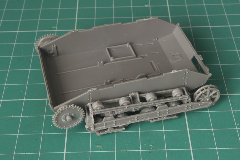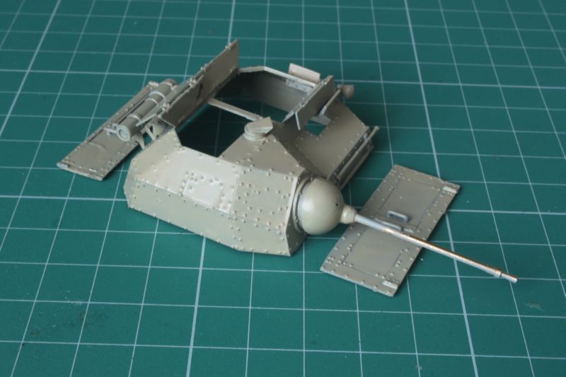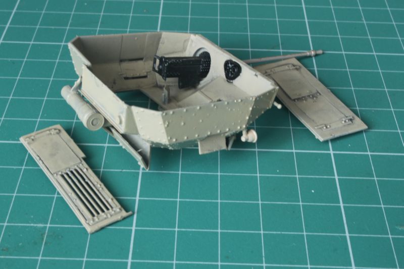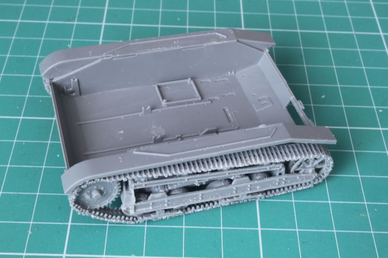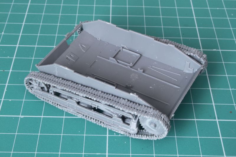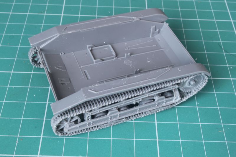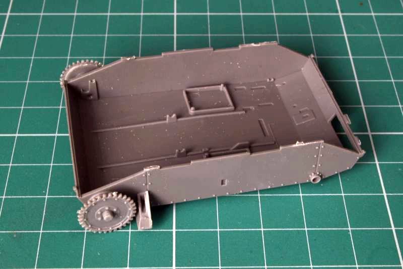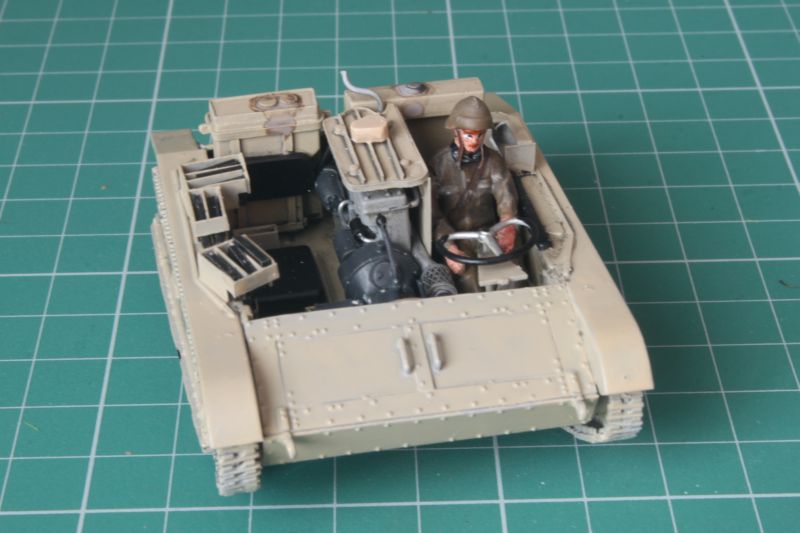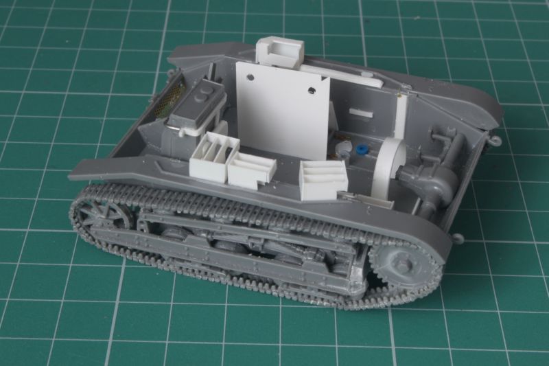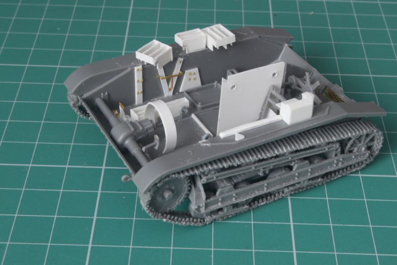 Teraz mogłem złożyć w całość model tankietki. Najpierw należało „posadzić” na swoim miejscu kierowcę dokleić przednią i tylną płytę, a następnie dokleić górę kadłuba. Tyle teoria. Praktyka natomiast była taka, że moja ingerencja w zestaw spowodowała, że nie wszystko do siebie ładnie pasowało. Dałem jednak radę…
