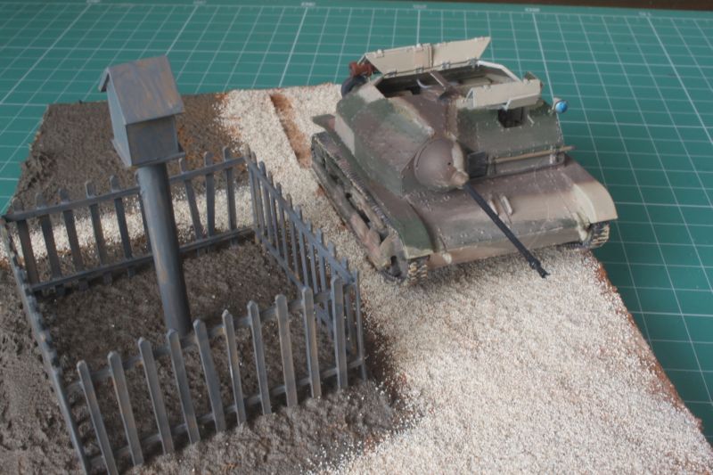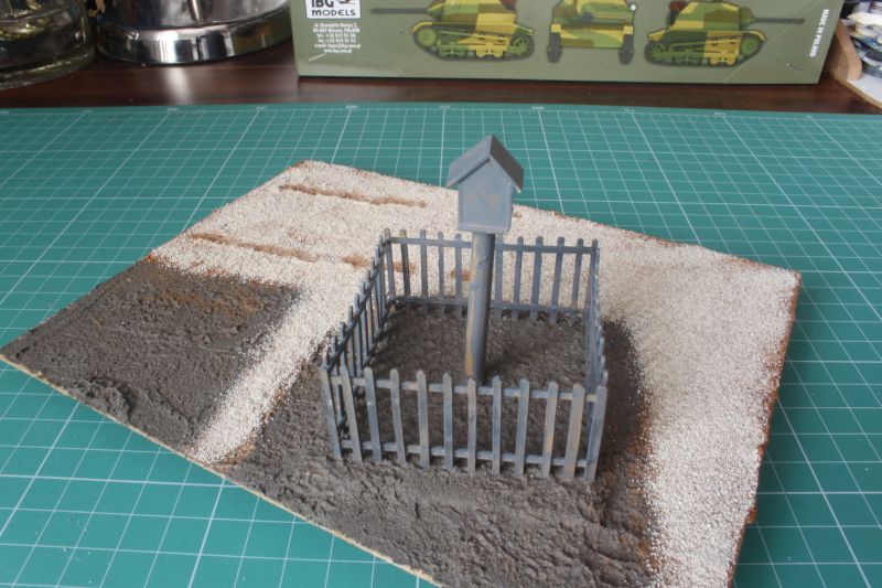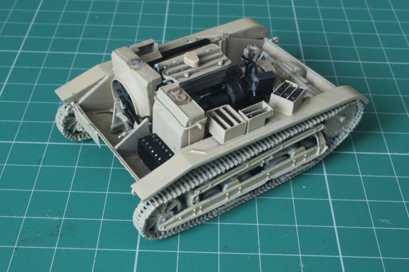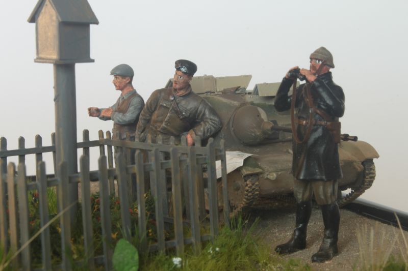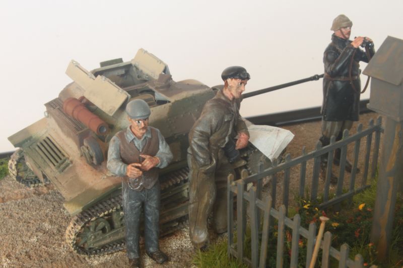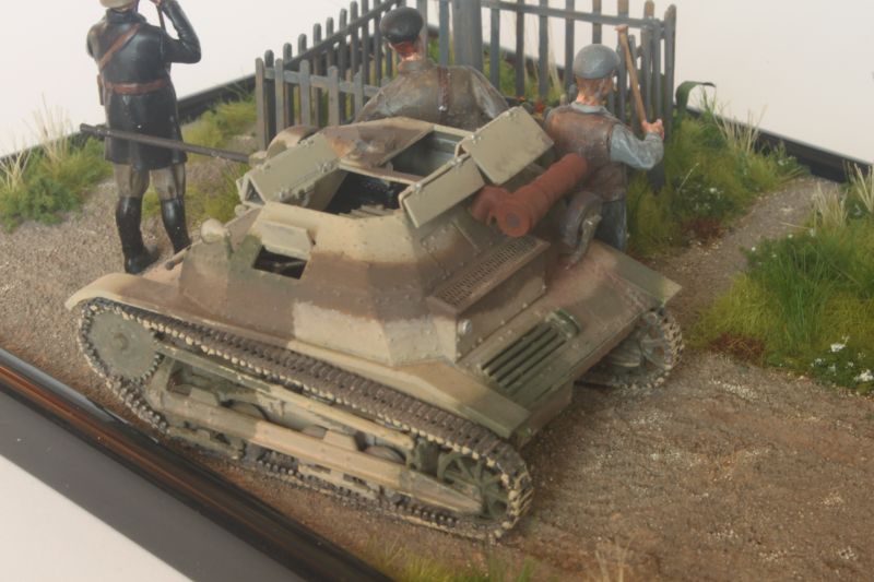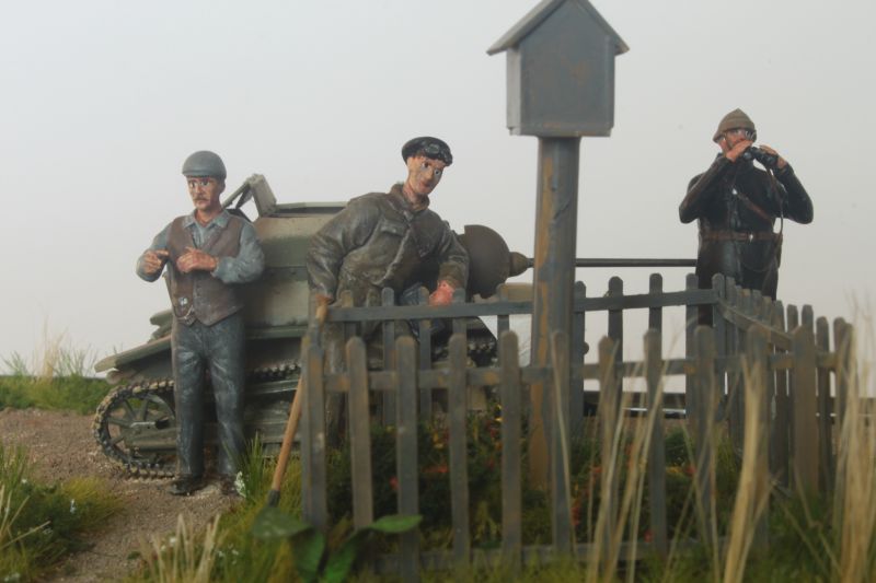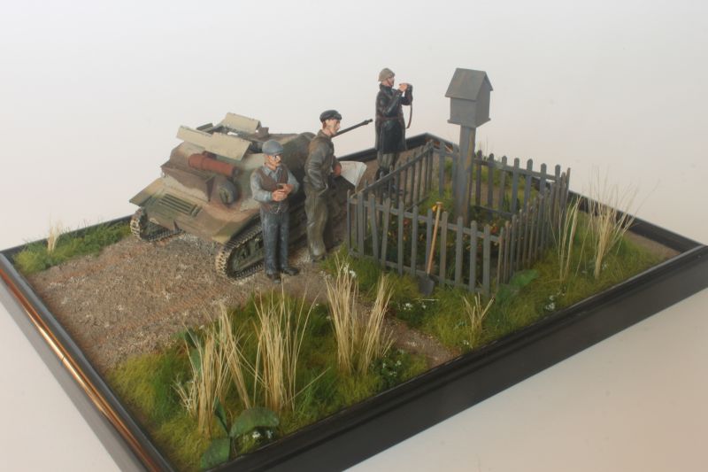 Kiedyś jeden z Kolegów miał koncepcję budowy dioramy ukazującej pojazdy, żołnierzy i osoby cywilne na drodze przed jakąś wiejską zagrodą. Miało to się nazywać „A więc wojna?” Ponieważ na naszych muzealnych magazynach było kilka figurek pasujących do tej scenki, postanowiłem je wykorzystać. Czyli zbudować dioramę. Nie miałem zamiaru jednak podkradać koncepcji kumplowi, dlatego zdecydowałem się nieco inną scenografię jak i nazwę, ale o tym później. Na razie skupmy się na klejeniu modelu tankietki.