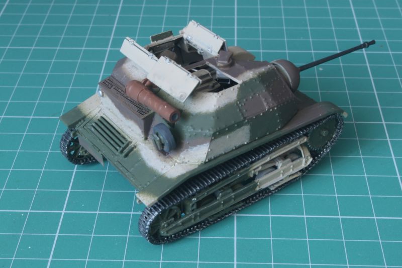… i mogłem zabrać się za nakładanie kolejnych kolorów kamuflażu. Malowałem podobnie jak w przypadku koloru bazowego lakierami z palety Hataka Orange Line. Postanowiłem pomalować model bez użycia  szablonów z wolnej ręki. Po zakończeniu malowania stwierdziłem jednak, że w przypadku kolejnych modeli użyję jednak szablonów z papieru i blue taca, unikając w ten sposób poprawek malarskich. Potem podobnie jak w przypadku wnętrza za pomocą farb akrylowych pomalowałem wszystko to, co miało kolor inny niż barwy kamuflażu i nałożyłem część śladów eksploatacji, czyli matowy werniks, ale z dodatkiem niewielkiej ilości szarej farby, takie dwa w jednym werniks i wasch. Troszkę obić, trochę rdzy na kolektorze spalin. Błoto i kurz pojazd miał dostać dopiero po ustawieniu na dioramie.