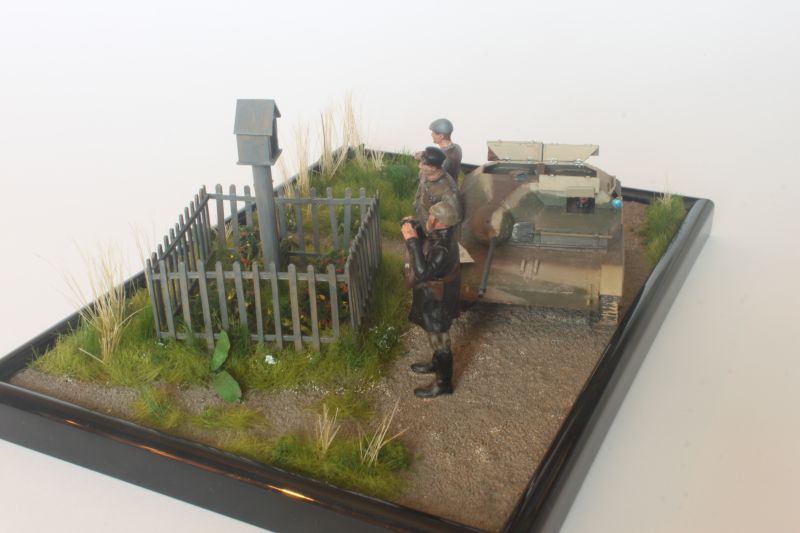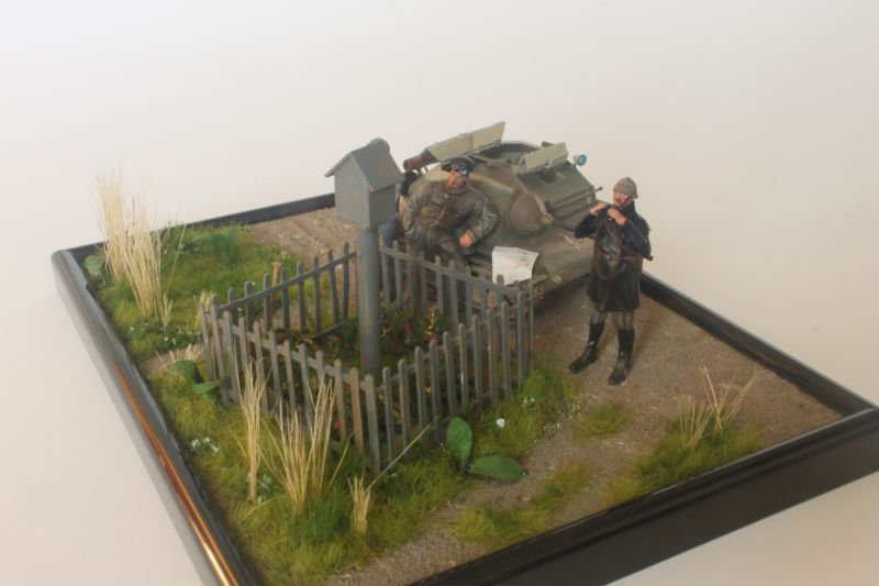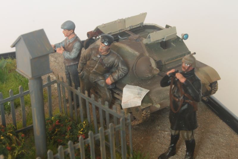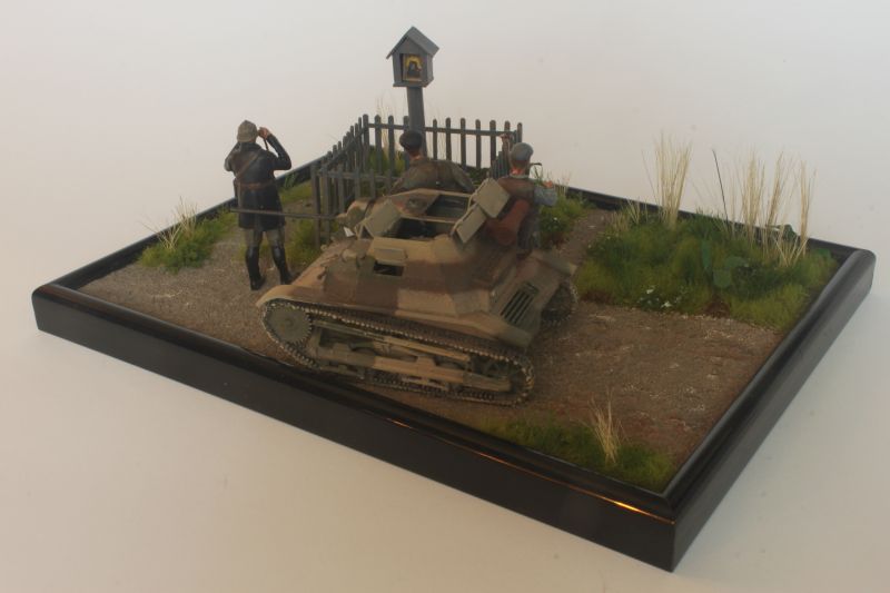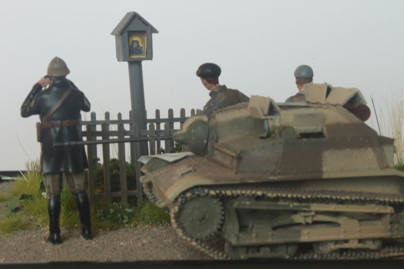 Wymyśliłem taką koncepcję mojej scenki - załoga TKSa do której dołącza jakiś podoficer z innego pojazdu obserwuje miejsce, gdzie miały być widziane pierwsze oddziały niemieckie. Widział je napotkany starszy pan, a teraz mocno zaniepokojony opowiada Pancernym, co widział. Kierowca siedzi w wozie z włączonym silnikiem, dowódca obserwuje przez lornetkę wskazane miejsce, zaś podoficer konfrontuje z mapą uzyskane informację i jeszcze nie dowierza, że „to jednak wojna!” Rozważałem różne rozstawienia elementów dioramy, jednak ostatecznie zdecydowałem na układ jaki przedstawiłem na zdjęciach. W kapliczkę wstawiłem ostatecznie ikonę z Matką Boską bo własnoręczne próby wykonania figury Madonny spełzły na niczym, a efekt mógłby obrazić uczucia religijne niejednej osoby.
