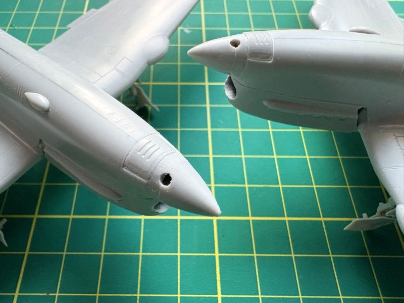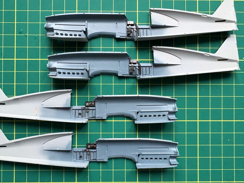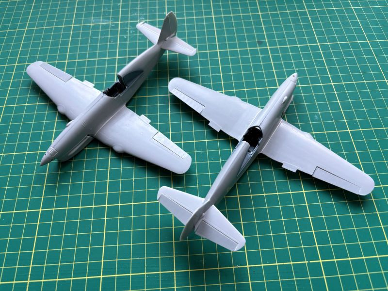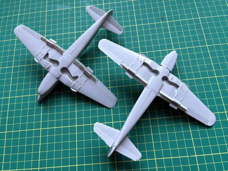 Na zdjęciach widać już oba modele sklejone w całość. Zanim do tego doszło, przeszedłem bardzo ciężką przeprawę, aby kadłuby z płatami prawidłowo spasować. To, że kadłuby wyszły mi odrobinę za szerokie wystarczyło. Zupełnie wystarczyło, bym musiał się solidnie namachać pilnikiem i kostkami ściernymi. Musiałem przy tym uważać, by dodatkowo nie skopać sobie geometrii w obu modelach. Konieczne było zebranie nieco tworzywa w miejscach łączenia górnych części skrzydeł z kadłubem, a także styku kadłuba w dolną częścią płata, zarówno z przodu jak i z tyłu. Pułapką także może okazać się wręga za silnikiem (element D12). W moich modelach było jej za dużo także w dół, przez co nie mogłem umieścić płata w prawidłowy sposób. Nie obeszło się tu bez szpachlówki. Właściwie bez szpachlówek. Klej cyjanoakrylowy posłużył mi do połączenia płata z kadłubem w jego dolnej części i przy okazji zaszpachlowania miejsc łączenia. Przejście skrzydło – kadłub w górnej części połączyłem już przy pomocy kleju pe terującego, zaś nierówności i ubytki usunąłem przy pomocy szpachlówki akrylowej Vallejo. Nakładałem kilka warstw, kolejna po wychynięciu poprzedniej.