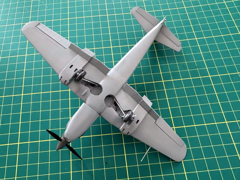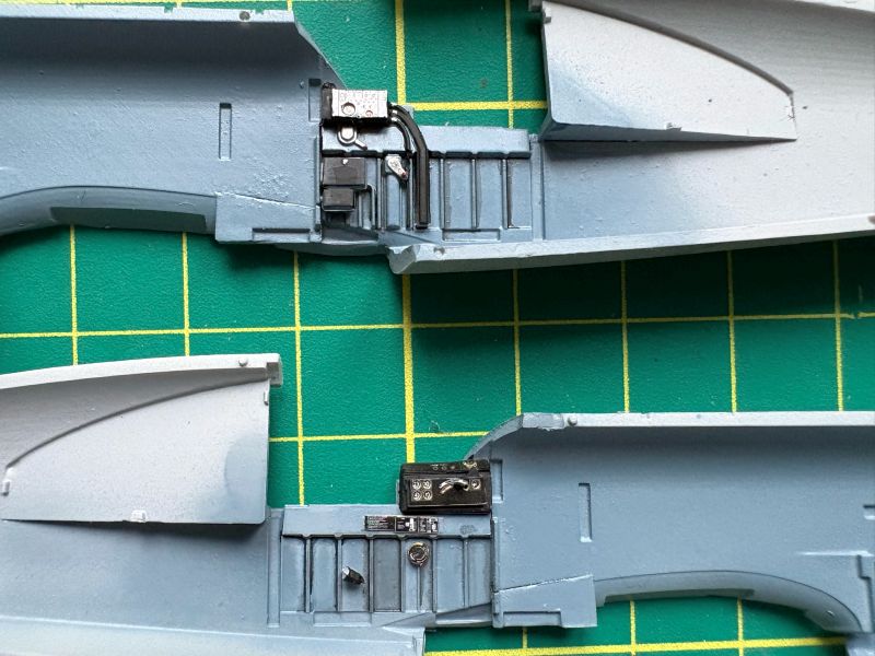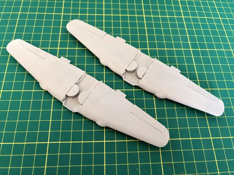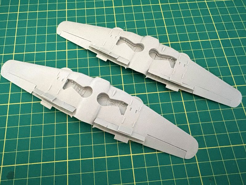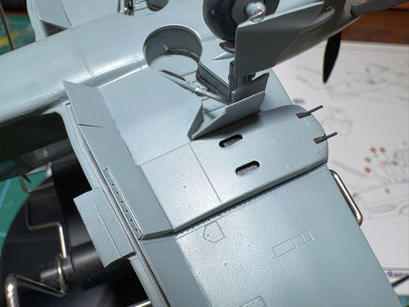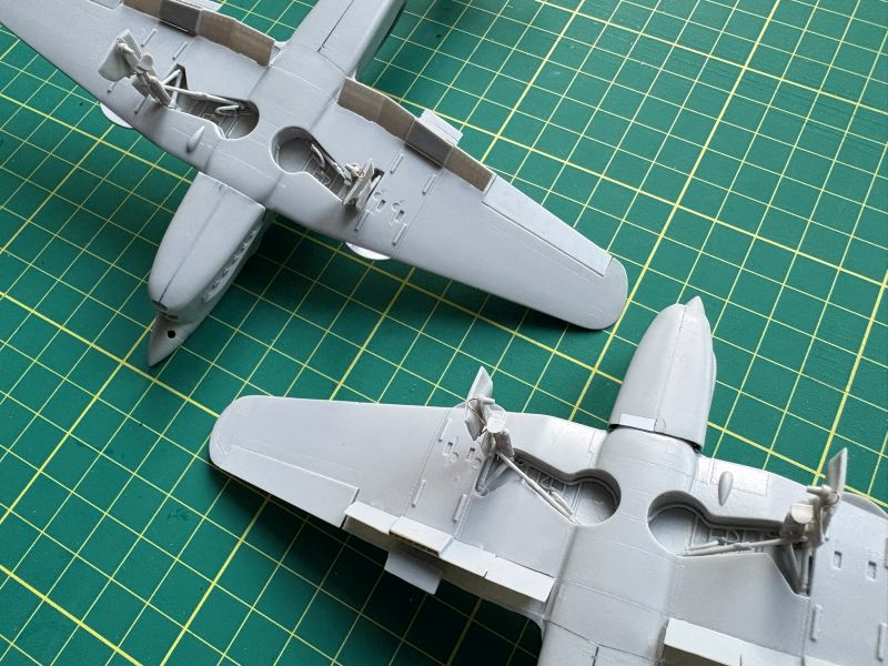Równolegle z kadłubami powstawały płaty w obu modelach. Pomimo całkiem niezłego spasowania z sobą poszczególnych elementów, także trzeba uważać, zwłaszcza przy zabudowie luków podwozia. Każdy w nich to kilkanaście dość skomplikowanych detali i z każdym trzeba uważać, dokładnie trzeba je obrobić i wzajemnie spasować. Stara modelarska zasada „trzy razy przymierz, raz sklej” ma tu jak najbardziej zastosowanie, ale trzy razy w przypadku tego modelu to stanowczo za mało. Z uwagi na makiety karabinów maszynowych, gondole w których się znajdowały postanowiłem wkleić na stałe po pomalowaniu modelu. Te akurat były spasowane idealnie. Podobnie jak klapy, które dla odmiany przykleiłem do skrzydeł już na tym etapie budowy. Chodziło mi o to, aby przed malowaniem skalic jak najwięcej elementów, ponieważ farba, jaka by nie była, osłabia spoinę. Fototrawione popychacze zastąpiłem wykonanymi od podstaw z kawałka polistyrenowego pręta. Korzystałem ze zdjęć z publikacji Single. Łatwiej było je wkleić i były solidniejsze.