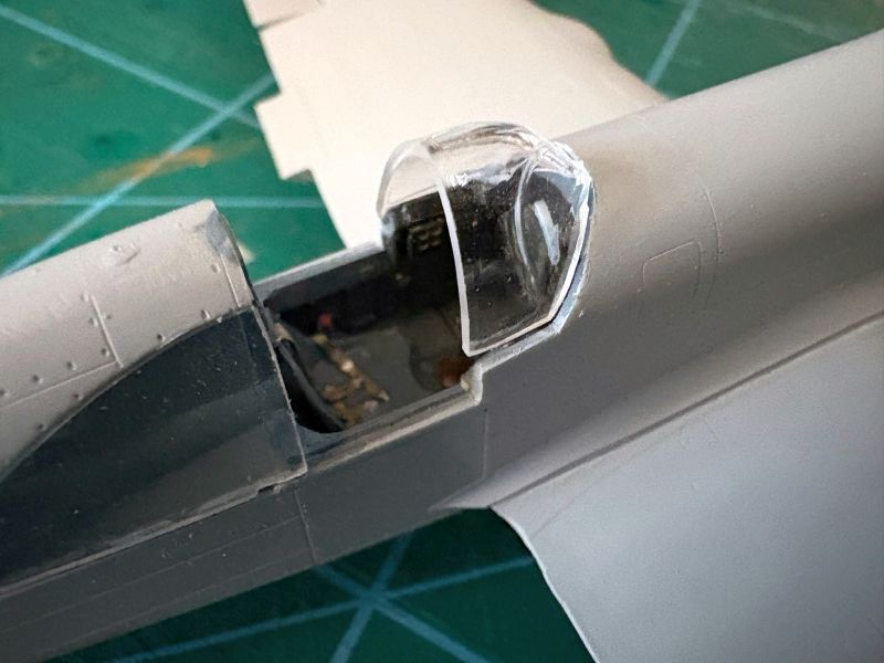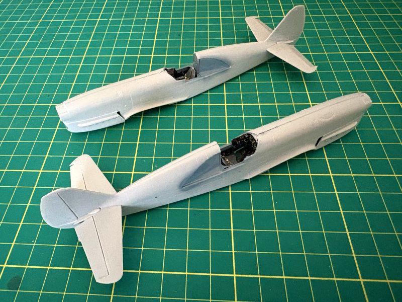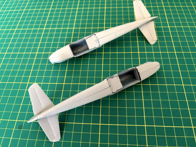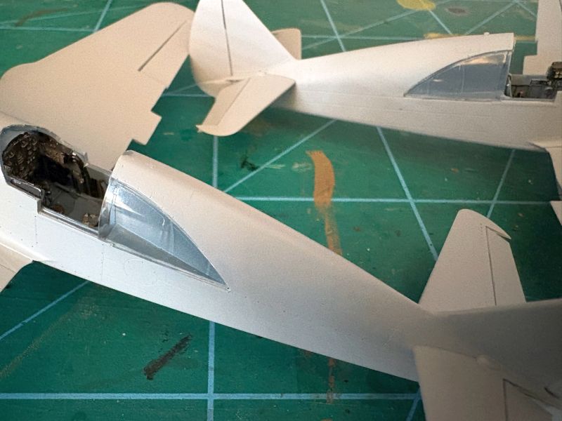 Kadłuby oczywiście dało się skleić w całość, ale niestety w obrębie kabiny nieco się rozeszły, co gwarantowało problem w prawidłowym umieszczeniem płata i wiatrochronu. Do sklejenia kadłubów w całość użyłem tradycyjnie w takich wypadkach kleju cyjanoakrylowego, wykorzystując go równocześnie jako szpachlówkę. Na szczęście tworzywo użyte do produkcji tych modeli obrabia się łatwo i przyjemnie. Na tym etapie zamontowałem także usterzenie. Też trzeba uważać na szczeliny montażowe usterzenia poziomego, są nieco za wąskie i za krótkie w stosunku do wypustów w statecznikach. Żeby dobrze weszły na swoje miejsca, konieczna jest odpowiednia korekta.