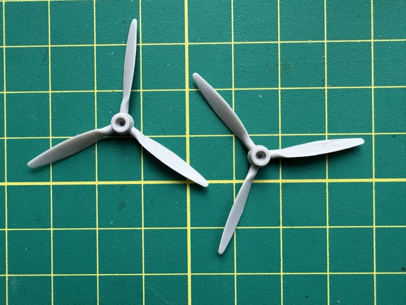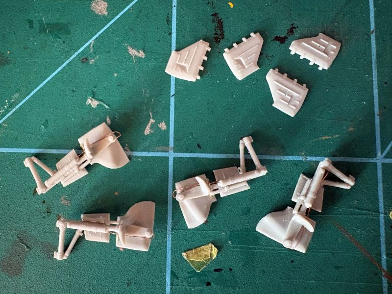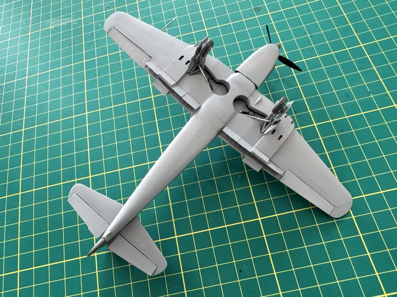 Na warsztat poszło wszystko, co musiało zostać zrobione prze rozpoczęciem malowania. Na pierwszy ogień poszło podwozie. To także newralgiczny etap budowy. Każda goleń składa się z kilku delikatnych elementów, zarówno polistyrenowych, jak i fototrawionych. Konieczne jest także złapanie prawidłowej geometrii goleni, o dokładnej obróbce poszczególnych detali nie wspominając. Po doprowadzeniu goleni do stanu takiego, jak widać na zdjęciach, uznałem, że lepiej będzie, gdy zamontuje je w modelu już na tym etapie prac. Z pomocą przyszło malowanie, cały dół Caudrona był w jednym kolorze. Osobno miły zostać zamontowane jedynie pokrywy z zawiasami przy skrzydłach oraz koła. Zapomniałem zrobić im zdjęcia ale też muszę zwrócić uwagę na konieczność spasowania z sobą opon i piast. To osobne elementy, co ułatwia malowanie, ale otwory w oponach trzeba trochę poszerzyć, albo jak kto woli zeszlifować piasty. Nie zapomniałem natomiast o wykonaniu zdjęć śmigłom i kołpakom. Kołapak składa się ze stożka i podstawy. Oczywiście nie pasują do siebie i trzeba coś z tym zrobić. Podstawy na sztywno przykleiłem do kadłubów, zaś stożki do nich klejem cyjanoakrylowym. Mogłem popracować przy nich narzędziami ściernymi, aby uzyskały poprawne kształty. Kołaki śmigieł były w kolorach kamuflażu, więc uznałem, że najlepiej będzie, aby zostały na swoich miejscach aż do zakończenia malowania. Potem je odkleję, zamontuję śmigła i dokleję powrotem już na stałe.