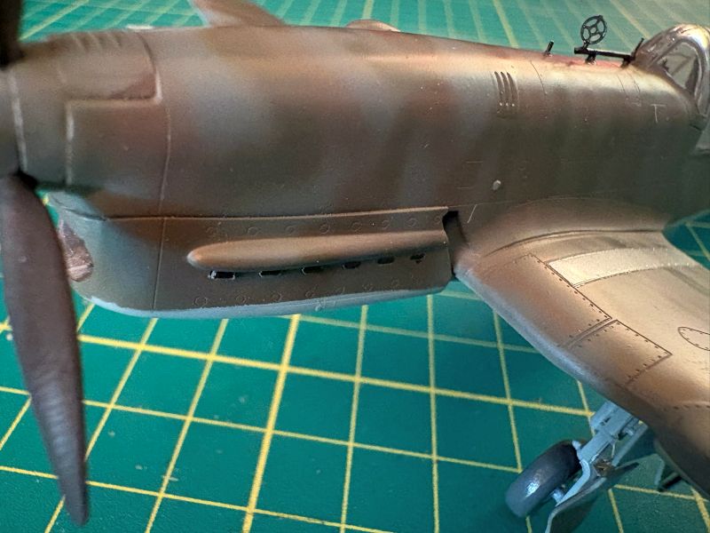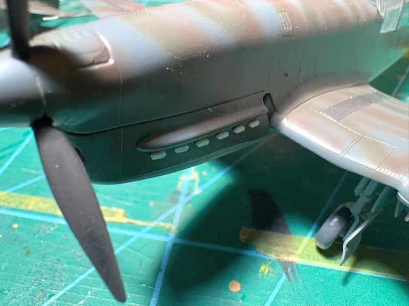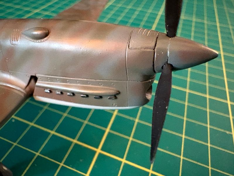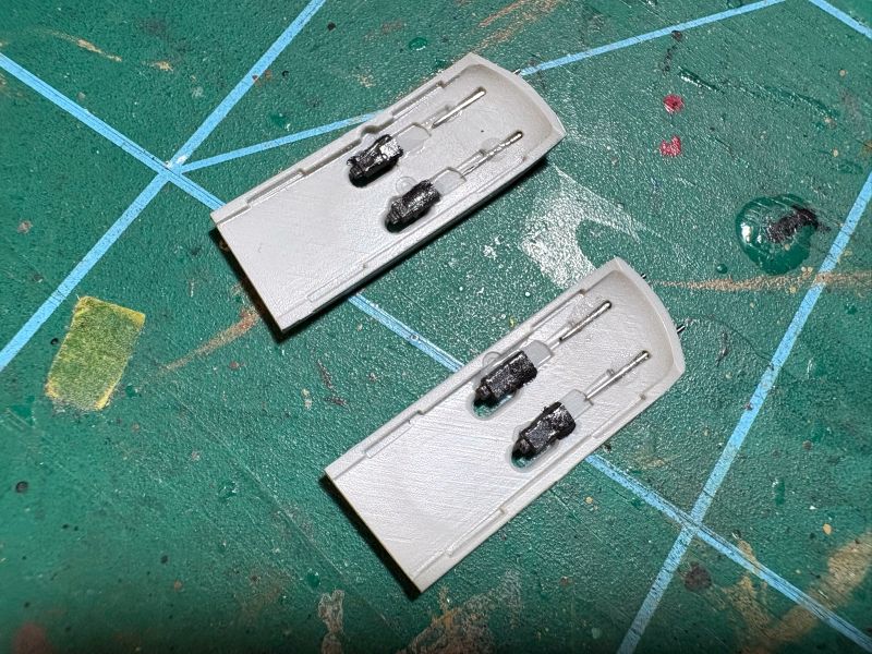 Karabiny także miały problem z wpasowaniem się w swoich miejscach. Ostatecznie w gondolach wylądowały jedynie tylce i to w części widocznej przez otwory wyrzutników łusek. Lufy wykonałem starą metodą z odpowiednio dobranych igieł iniekcyjnych. Po tych zabiegach montaż uzbrojenia był bezproblemowy.