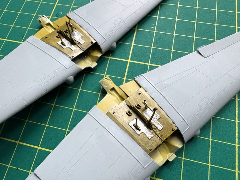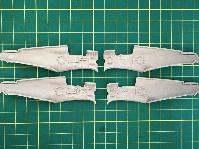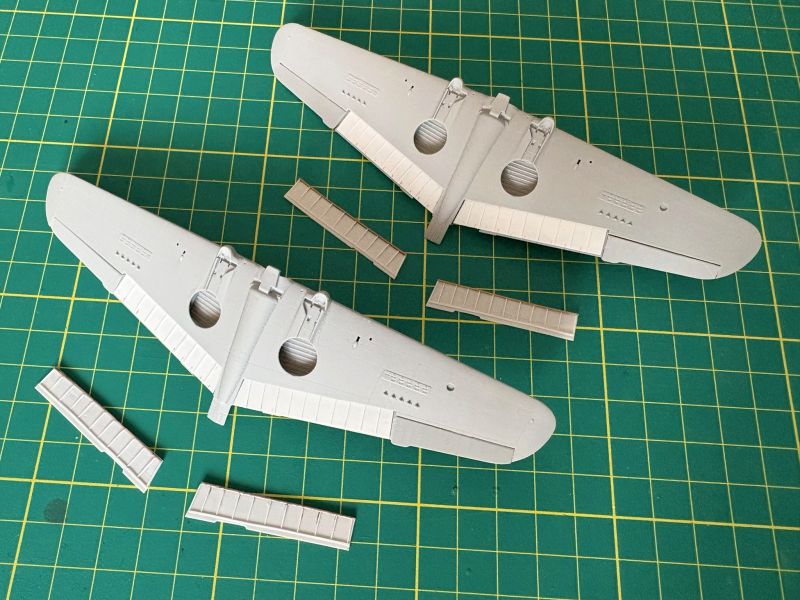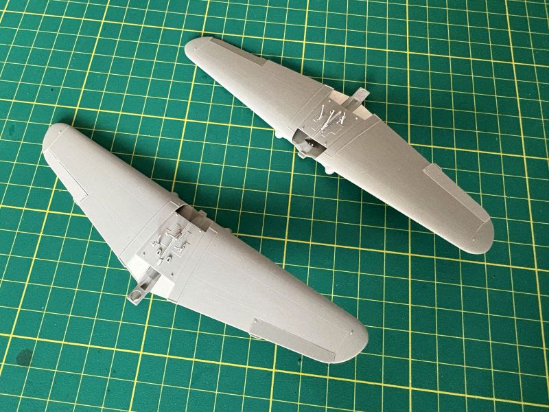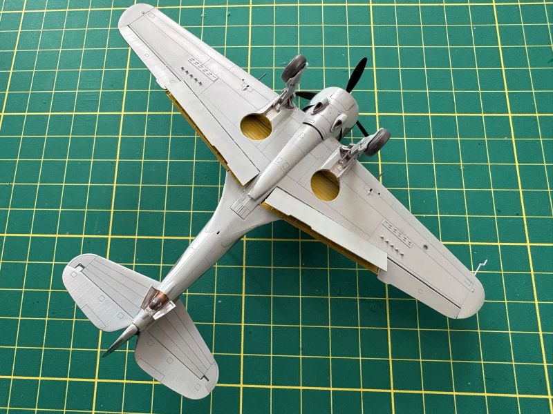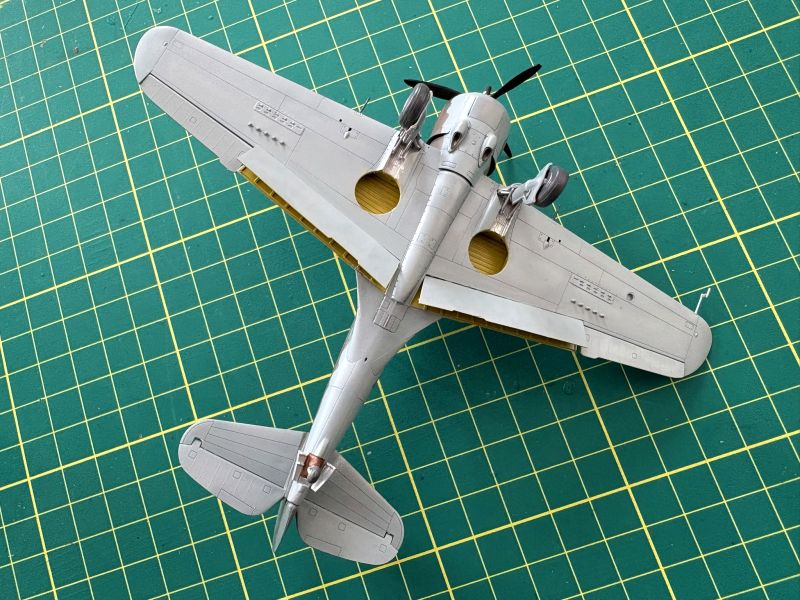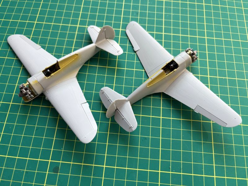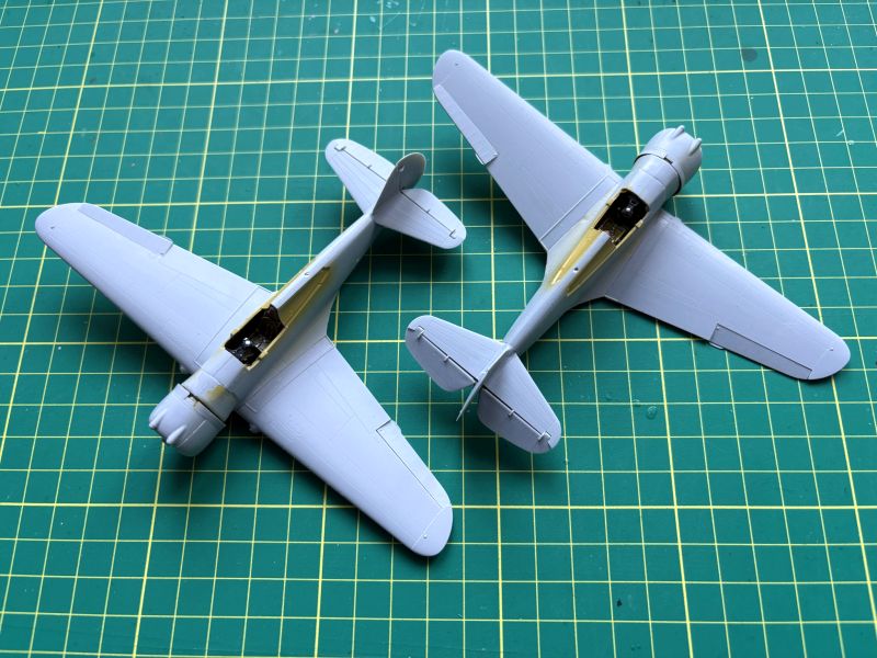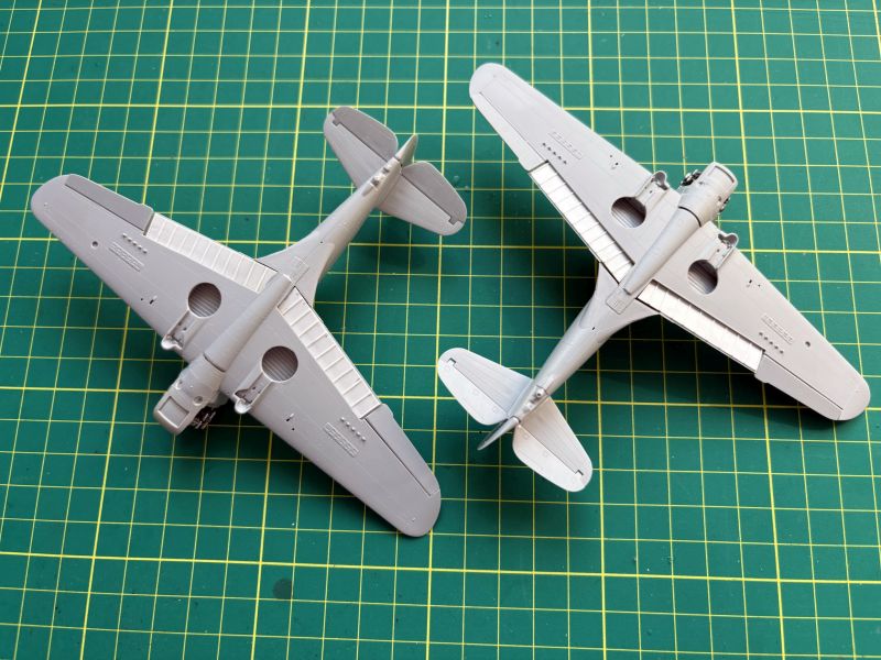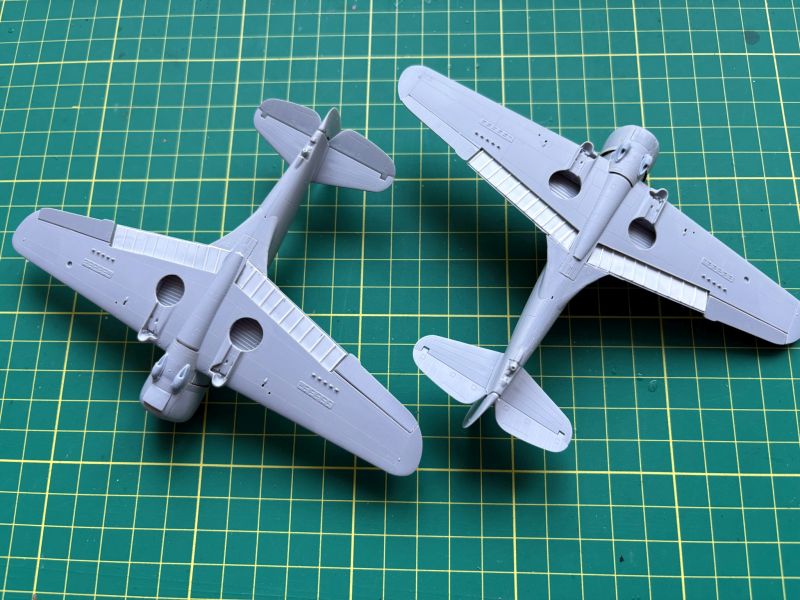 Zatem na warsztat trafiły dwa Curtissy z Arma Hobby. Kiedy przystępowałem pracy, powstało już kilka pięknych modeli tego samolotu, więc pojawiające się tu i ówdzie twierdzenia o wątpliwej jakości tego zestawu można włożyć pomiędzy bajki. Swoje modele postanowiłem nieco zwaloryzować. Wykonałem wychylone lotki, co nie było żadnym problemem, oraz wychylone klapy. Nie wdawałem się w szczegółowe odtwarzanie ich konstrukcji, zerknąłem tylko na posiadane zdjęcia. Odtworzyłem je tak, żeby coś było widać. Ponieważ Arma bardzo ładnie wykonała luki podwozia odpuściłem sobie w obu modelach wklejanie brezentowych pokrowców. Skrzydła i częściowe wyposażenie kokpitów miałem zatem gotowe.