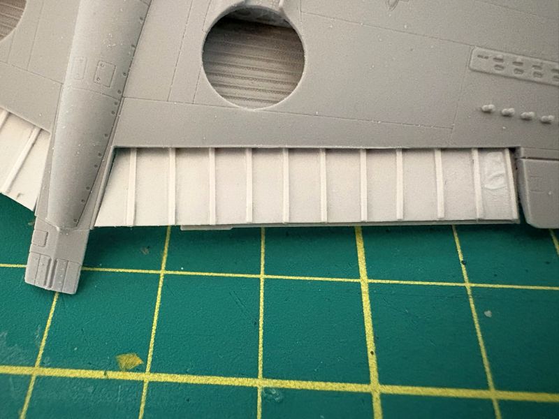 Kadłuby zostały następnie sklejone. Po obróbce miejsc łączenia dokleiłem usterzenia i wkleiłem płaty. Nie było tu żadnego problemu, wszystko idealnie pasowało do siebie. Ku własnemu zdziwieniu nie miałem także problemu z wpasowaniem płata w kadłub w tylnej jego części. Może dlatego, że wyciąłem otwory pod wnęki klap? Może dlatego, że wiedziałem, że inni mieli tam przygody i zdążyłem się do tego przygotować, odpowiednio spiłowując krawędzie płata i kadłuba w tym miejscu. Zabawa pojawiła się natomiast z przodu. Okazało się, że doklejane osobno dwa elementy przodu kadłuba nie chcą się zejść z dolną jego częścią. Co było robić? W powstałe szczeliny wkleiłem odpowiednio przycięte paski polistyrenu i po wyschnięciu obrobiłem.