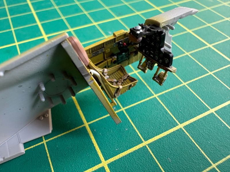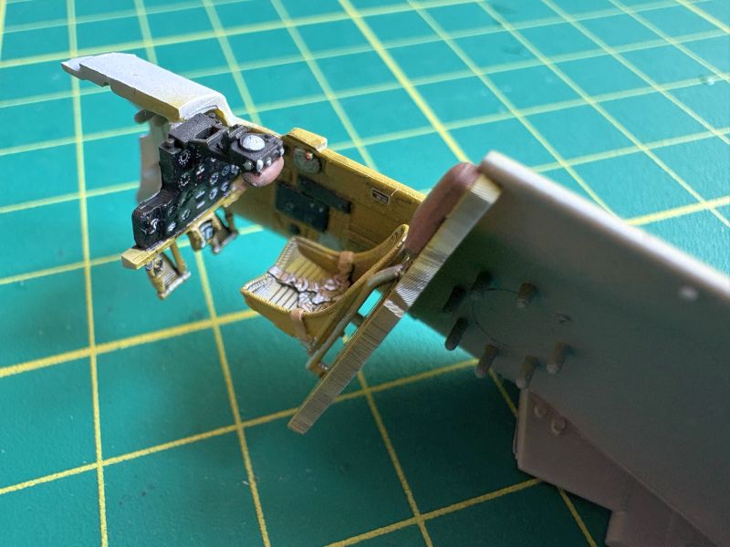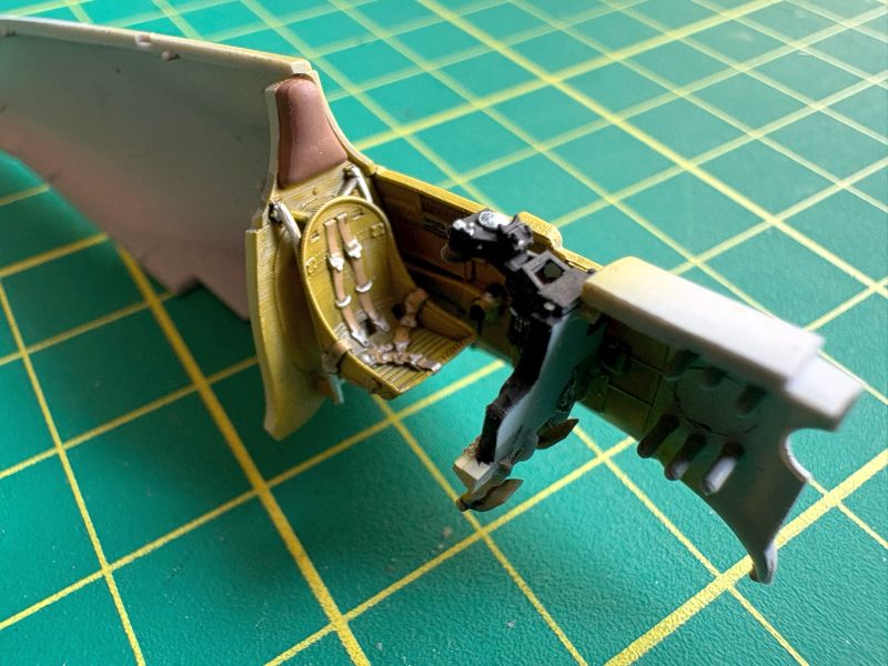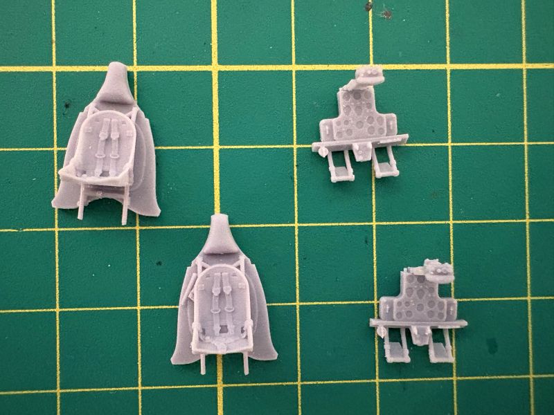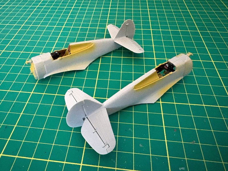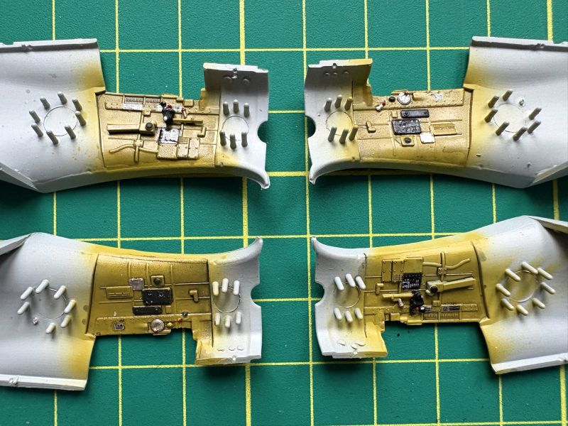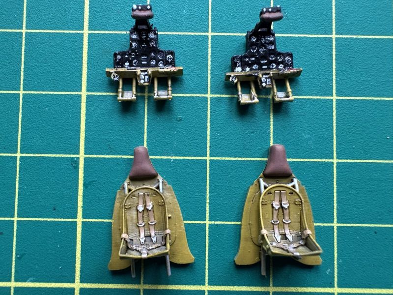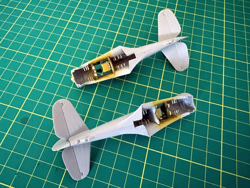 Co w pełni można było zobaczyć po pomalowaniu kokpitów. No i oklejeniu kalkomaniami. Tablice przyrządów oraz wręgi z fotelami wkleiłem w lewe burty kadłubów i ostawiłem do całkowitego wyschnięcia kleju.